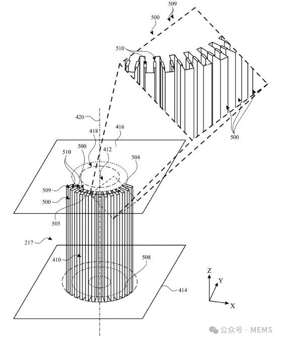 一项实施例中圆柱形波纹状MEMS结构的俯视图,其中,当电压被施加到固定径向电极(900)和/或圆柱形波纹状MEMS结构的电极(510)时,电极(510)可被排斥或吸引到固定径向电极(900),以驱动波纹状结构(509)变形或弯曲