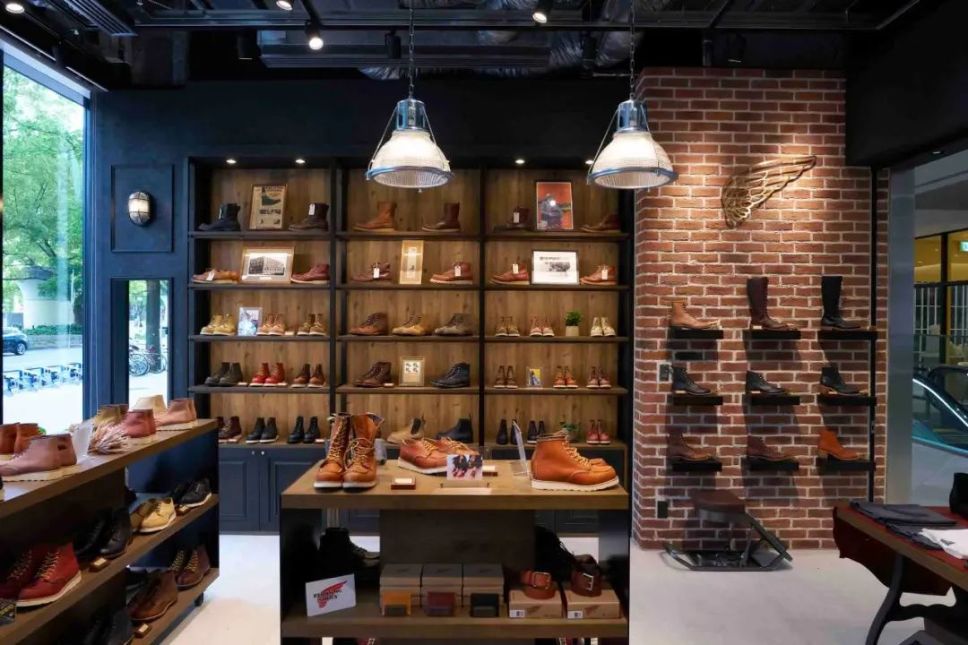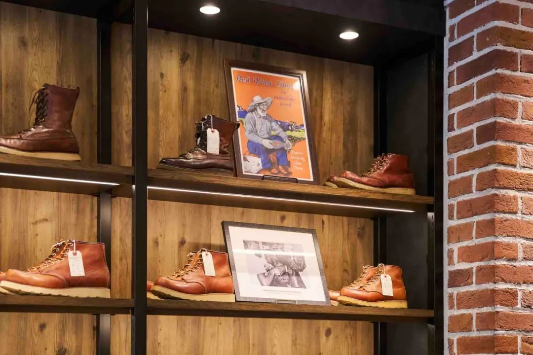 以布里克和木质为基调的古典风格的店内,以及与氛围相配的“红翼”的靴子。收银台后面存放的鞋盒墙也是一大亮点。