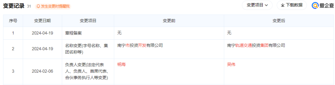 南宁轨道交通集团有限责任公司公告,根据《南宁市国资委关于组建南宁轨道交通投资集团有限公司有关事项的通知》等文件,将本公司的股权全额划转至南宁市投资开发有限公司名下,将南宁市投资开发有限公司更名组建成新的集团公司一一南宁轨道交通投资集团有限公司。公司控股股东工商变更手续预计于2024年5月完成。