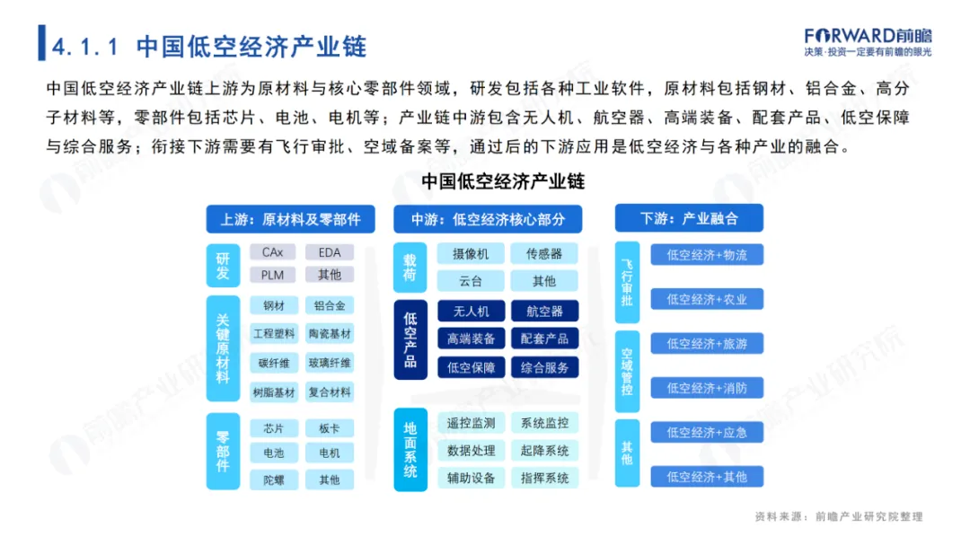 纵观低空经济,上游是原材料与核心零部件,包括钢材、铝材、碳纤维等航空材料,以及芯片、电池、电机等零部件;中游涵盖无人机、eVTOL的制造,以及遥感、监测、指挥等服务;下游则延伸到应用场景,从城市交通、外卖物流,到休闲旅游、工业巡检,全面融合、无处不在。
