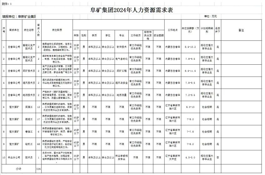 此次计划招聘 114人,具体要求详见《阜矿集团2024年人力资源需求表》(附件1),条件特别优秀者可适当放宽。