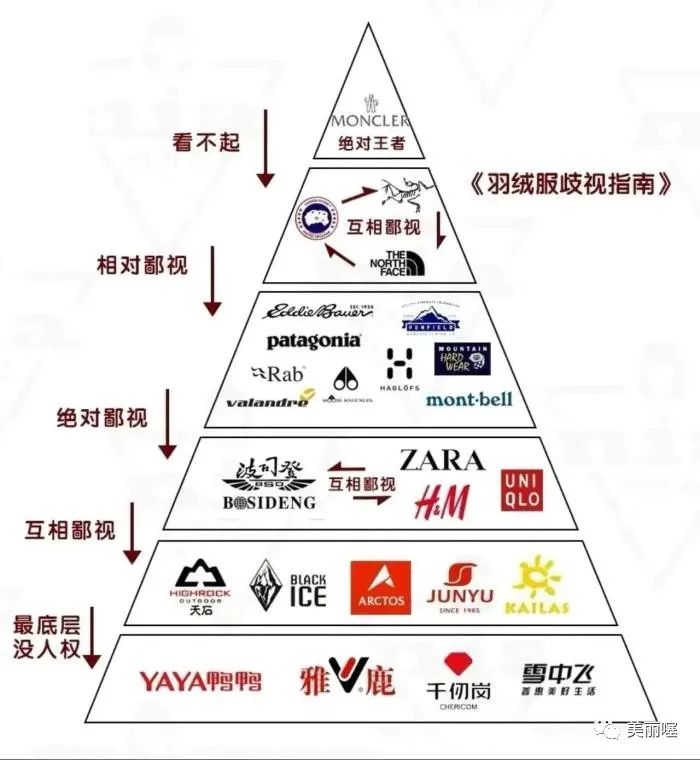 这张图中由从上至下的顺序,排列着价格由高到低的羽绒服品牌。排名第一的是“MONCLER(蒙克莱)”,而较为常见的大鹅、北面则在第二,再接下来的有mont-bell、波司登、BlackICE、YAYA鸭鸭。