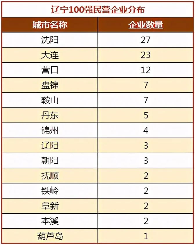 综合来看,辽宁省100强民营企业,分布在全省14个地级市,有27家位于沈阳,23家位于大连,12家位于营口;盘锦、鞍山各有7家,丹东有5家,锦州有4家,辽阳、朝阳各有3家,抚顺、铁岭、阜新、本溪各有2家,葫芦岛有1家。