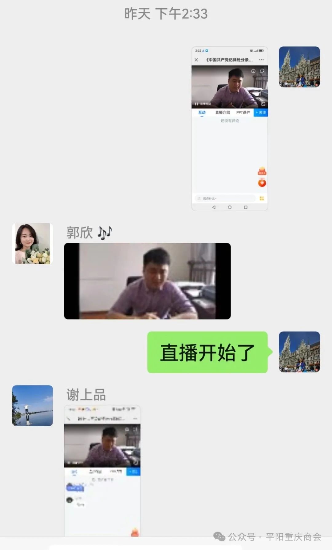 为深入贯彻习近平总书记关于党纪学习教育的重要讲话和重要指示精神,落实中央、市委和市工商联党组关于党纪学习教育的相关文件精神和工作部署要求,推动全市工商联系统党纪学习教育走深走实,4月29日14:30,市工商联通过线上培训方式组织渝商微课,邀请了重庆市中国特色社会主义理论体系研究中心卢旭东副教就“《中国共产党纪律处分条例》解读”进行授课。平阳重庆商会党员和入党积极分子在党支部纪检宣传委员、重庆伊尔美化妆品有限公司CEO黄绍昆办公室,集中收看学习讲座。党员温合疆在自己公司收看,万州工作的入党积极分子谢上品在工作岗位上收看。