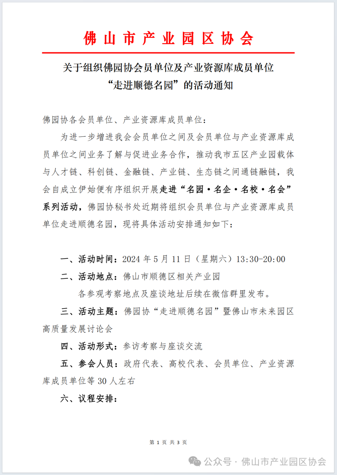 佛山市产业园区协会(以下简称“佛园协”)业务主管单位为佛山市工业和信息化局,于2023年4月27日经佛山市民政局批准予以登记。