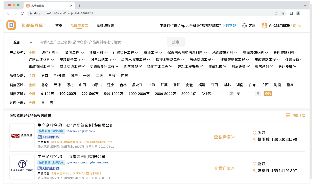 “都都品牌库”整合了建材生产企业工商信息 (企业名称、品牌logo、注册资金、法人代表、成立时间、注册地址、经营范围、企业简介等) 、营业执照、产品资质证书、企业或产品宣传视频、产品宣传册、各个区域供应商联系人及联系方式、主营产品、品牌推荐次数、业绩项目、材料设备价格等多维度信息,为推荐品牌提供完整的数据支撑。