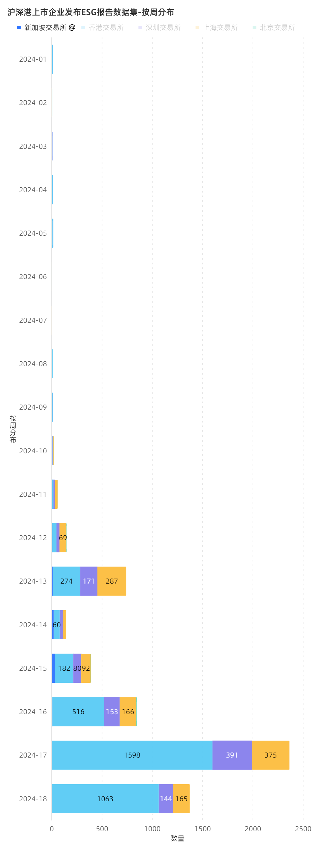 根据青悦ESG报告数据库(https://esg.epmap.org/reports)自动实时收录的数据,截至发稿时为止,2024年京沪深港新交易所上市公司截止目前已披露6159份ESG中英文报告,其中第18周新发1372份,其中4月29日(周一)单日披露784份,也是今年以来披露最多的一天。