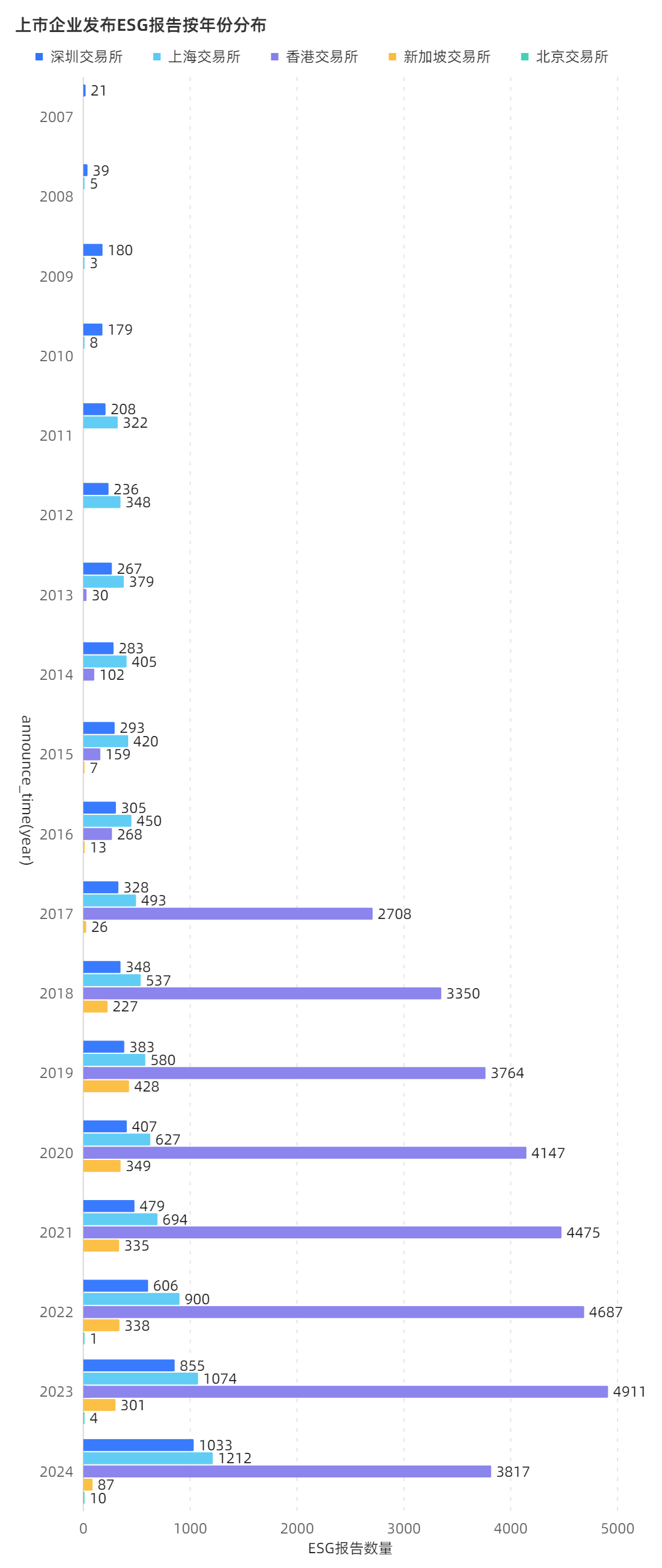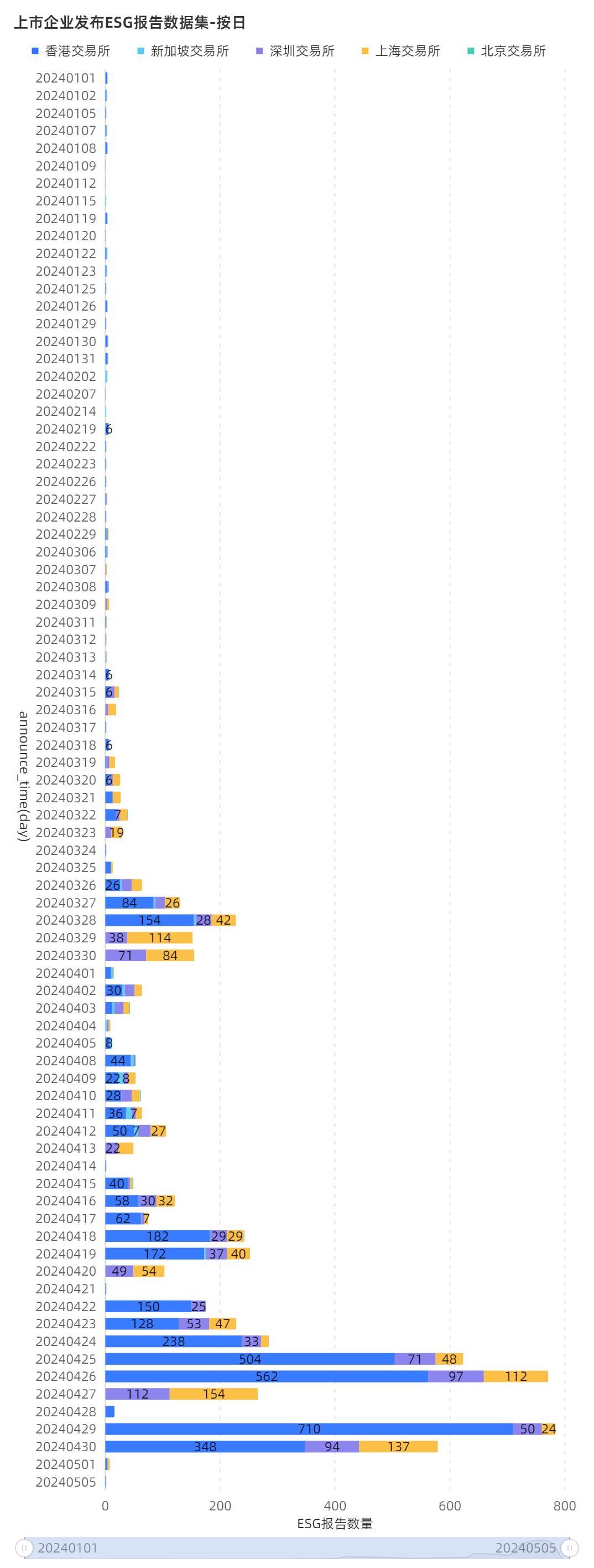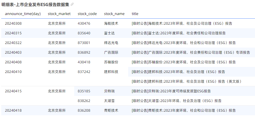 上交所上市公司截止2024年5月1日已发布1212份ESG报告,超去年全年1074份;深交所上市公司已发布1033份,超去年全年855份;北交所上市公司已发布10份,超去年4份。