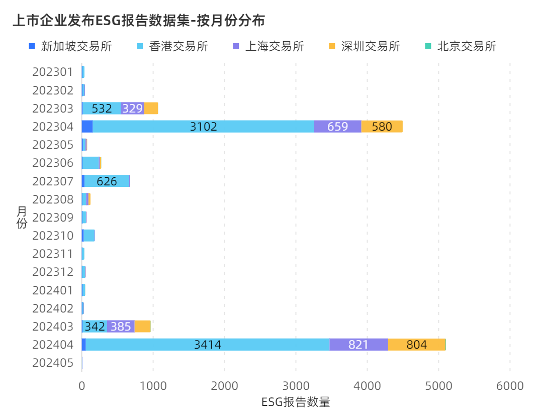 根据以下两年期的月份统计可见,在6/7月份港交所还会有一波发布高峰,且全年各个月份各个交易所都有企业在陆续发布ESG报告。