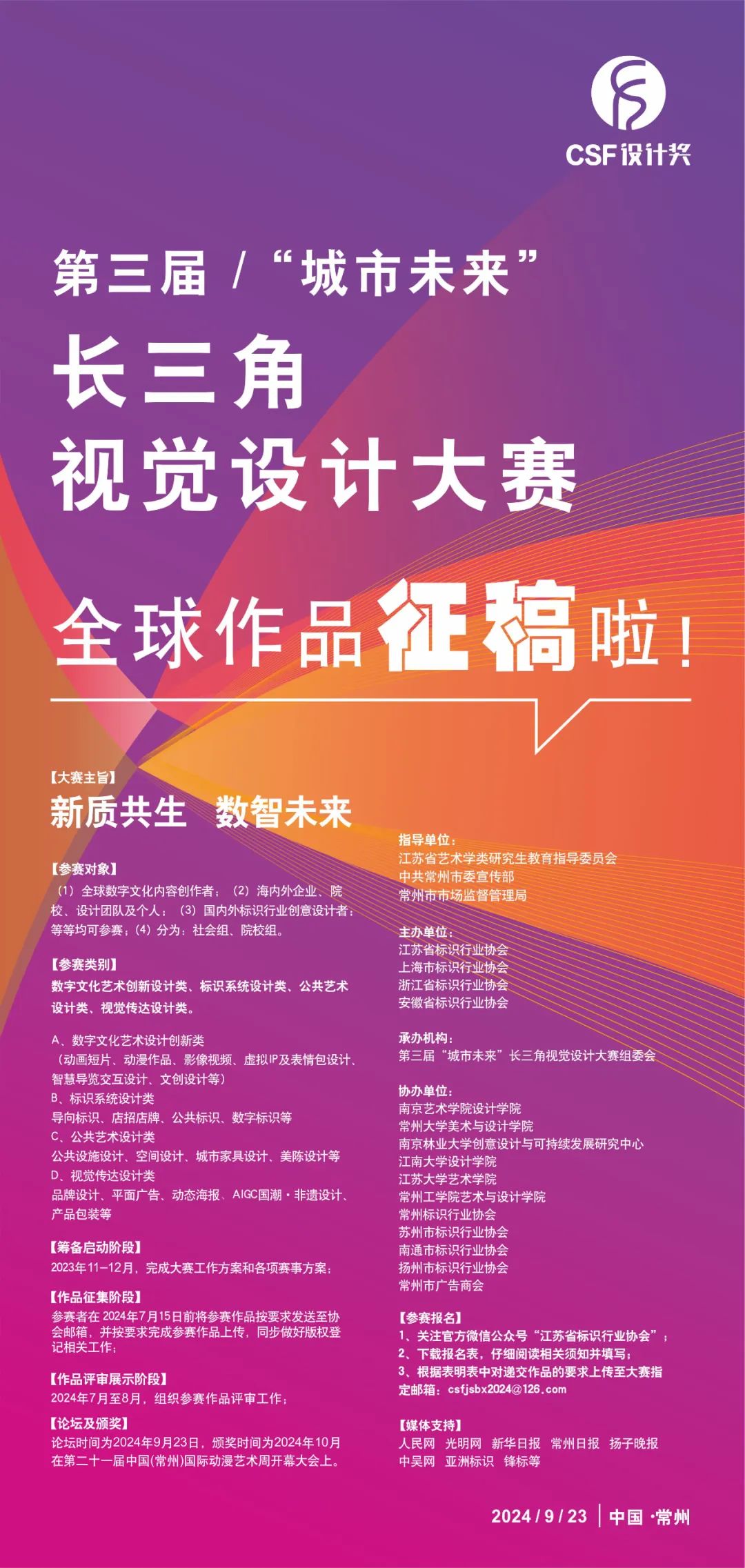 为认真贯彻落实中共中央办公厅、国务院办公厅印发的《关于深化现代职业教育体系建设改革的意见》和教育部印发的《高等学校人工智能创新行动计划》等文件精神,2024年第三届“城市未来”长三角视觉设计大赛由江苏省标识行业协会轮值牵头,联合上海市标识行业协会、浙江省标识行业协会、安徽省标识行业协会共同主办。