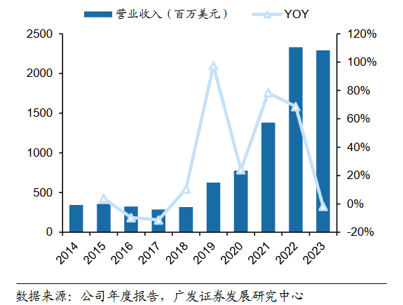 △第三阶段:2018年美国301关税对中国光伏逆变器征收10%关税,公司凭借本土化产能优势收获美国贸易壁垒红利。2019年5月关税税率提高至25%,同年华为宣布退出美国逆变器市场,2021-2022年新能源行业爆发带动公司营收提速,2023年受行业去库存影响收入首次下滑。