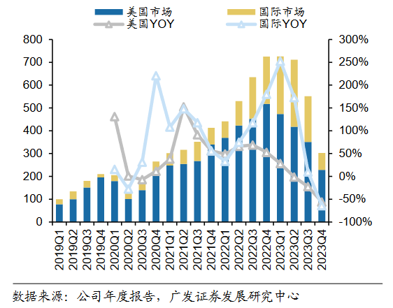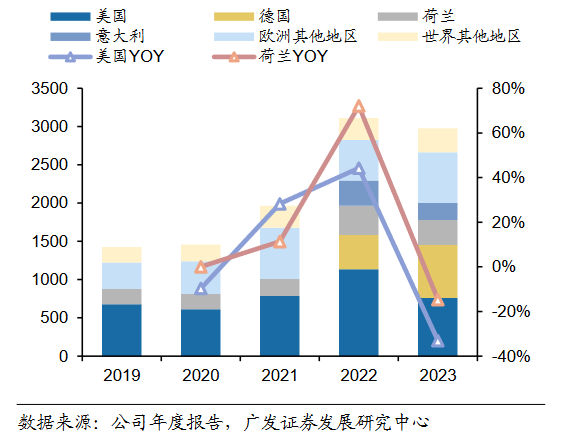 23年公司光伏业务中欧洲/美国市场营收分别达18.1/7.6亿美元,同比+15.8%/-35.9%,欧洲市场在23年初供应链缓和后仍实现快速增长,但下半年受高利率+荷兰、比利时、意大利等国家上网电价政策与补贴政策摇摆不定导致需求大幅萎缩,虽全年保持小幅增长但环比下滑超55%。美国市场亦然,加州NEM 2.0政策向3.0过渡导致分布式光储需求出现真空期。