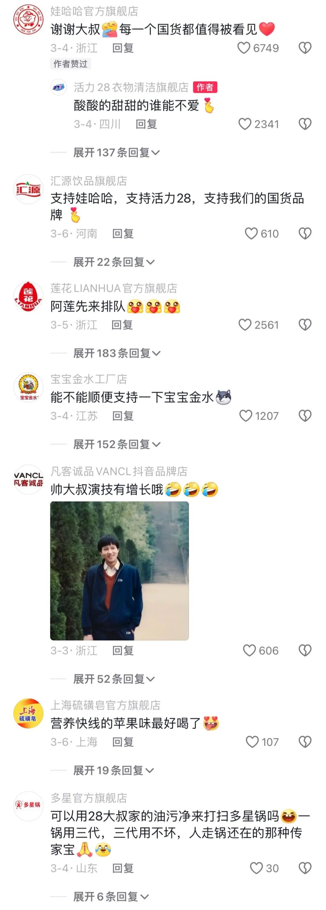 除了准时发疯、随时发疯、借势发疯,还有品牌每天在互联网上溜达,哪里有热点,哪里就有品牌,他们与当下热门品牌联动一起“发疯”。如在国货活力28火了之后,其抖音评论区俨然变成了众多国货品牌的“广告专区”,求关注求认识的品牌比比皆是,也让众多老牌国货有了迎接泼天富贵的机会。