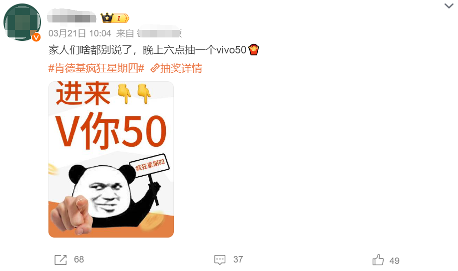 同样是玩发疯营销出圈,肯德基在每周四固定打折促销,形成了具有品牌特色的代名词,让肯德基疯狂星期四衍生的“疯四文学”成为了用户之间沟通的社交语言,V50、今天可是疯狂星期四等。