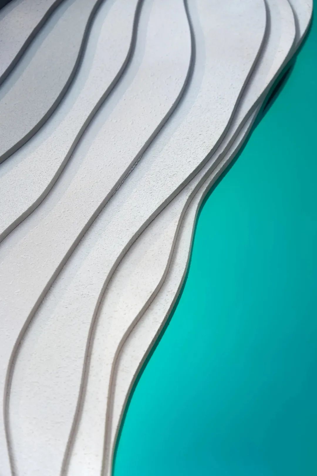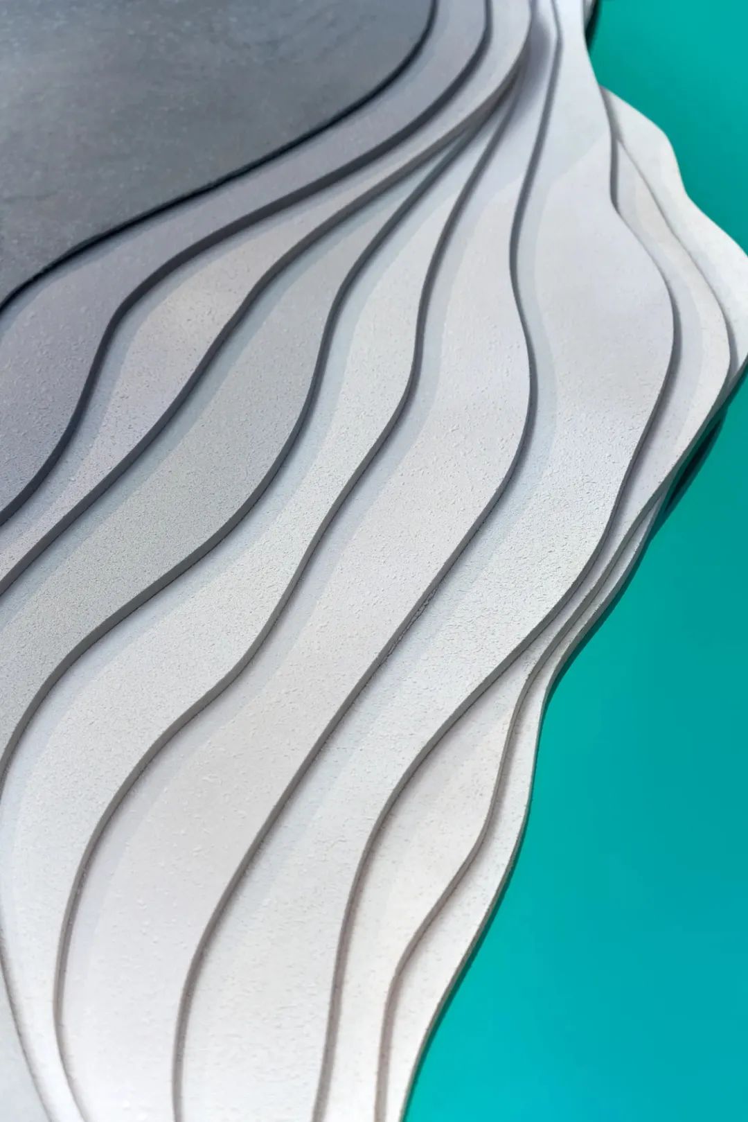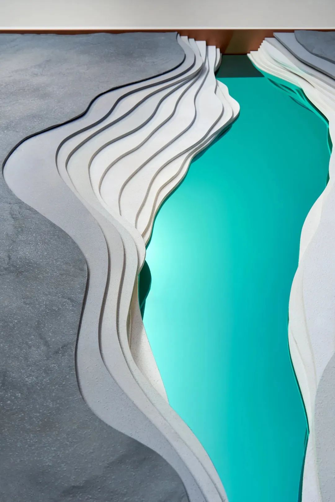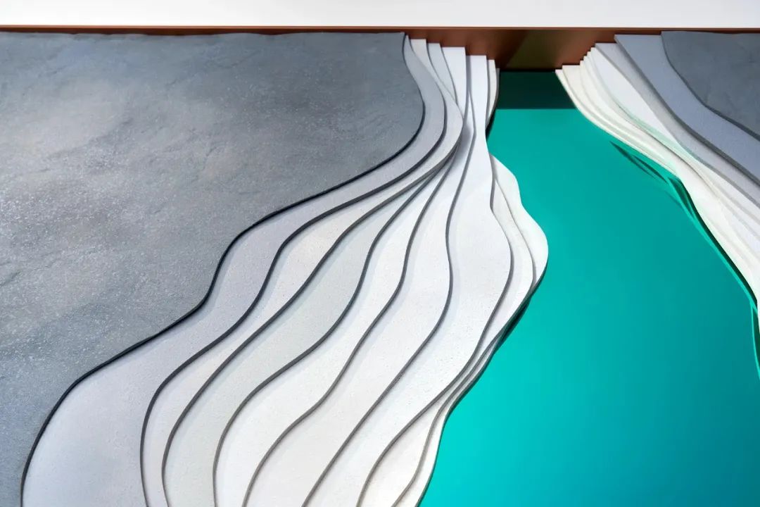 另一个令人印象深刻的装置是“世界边缘”。它的灵感来源于诺曼底埃特拉特的白垩悬崖,这片曾经是海底如今却成为水下景观一部分的自然奇观。装置从侧面观看呈现了一个假设的悬崖和海洋深处的头顶横截面,为熟悉的景观提供了全新的视角。这种对自然变形、水陆领域模糊以及悬崖形状的巧妙运用,不仅展示了艺术家们的创新精神,也为餐厅空间带来了独特的自然之美。