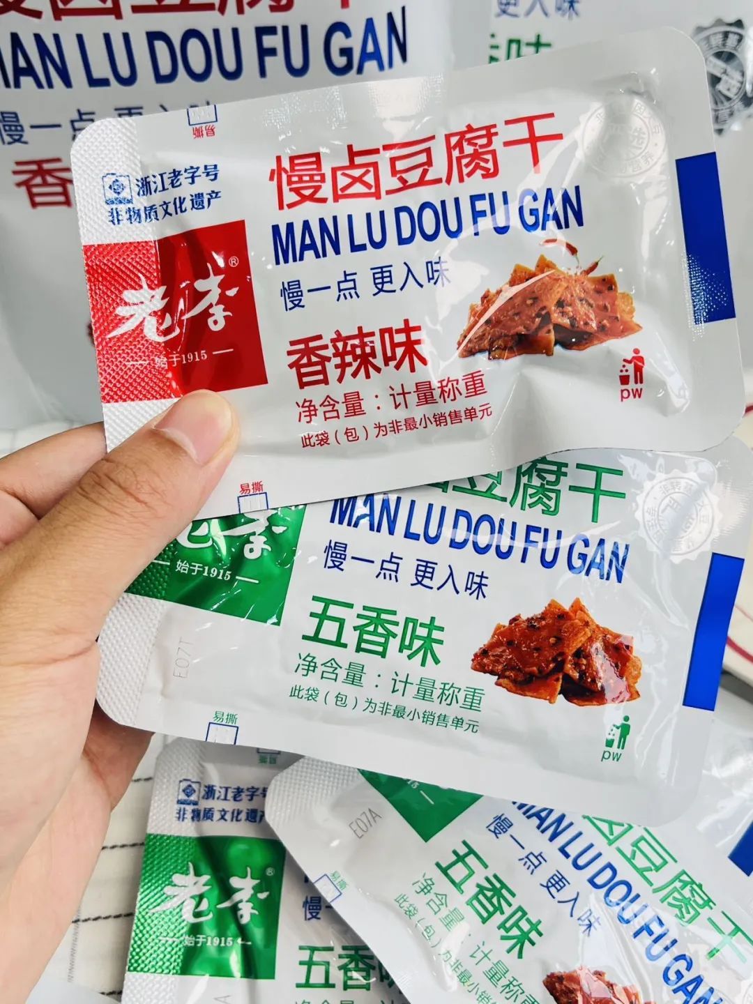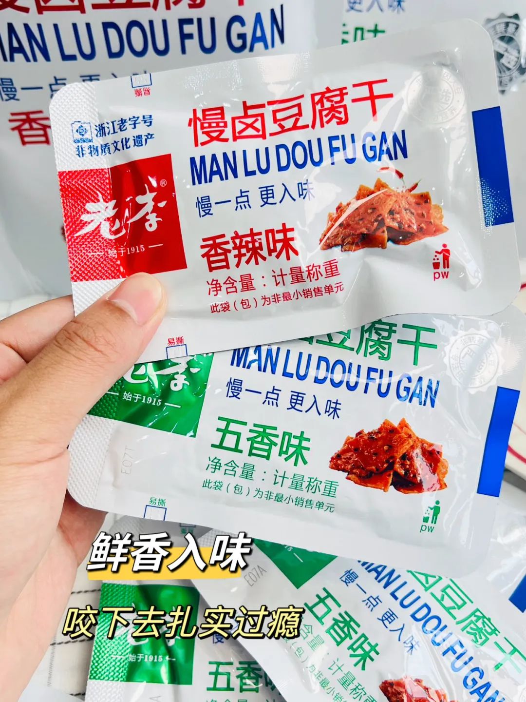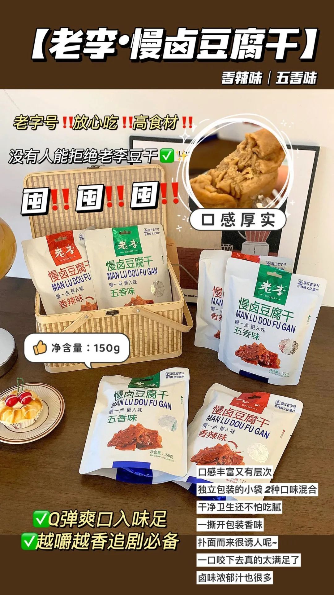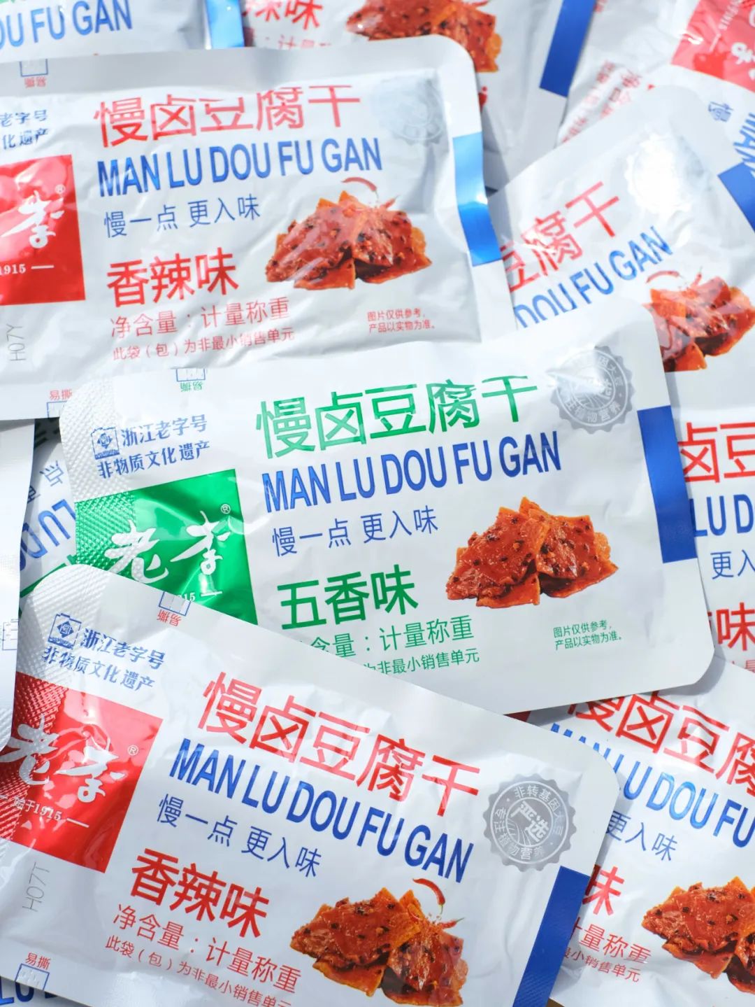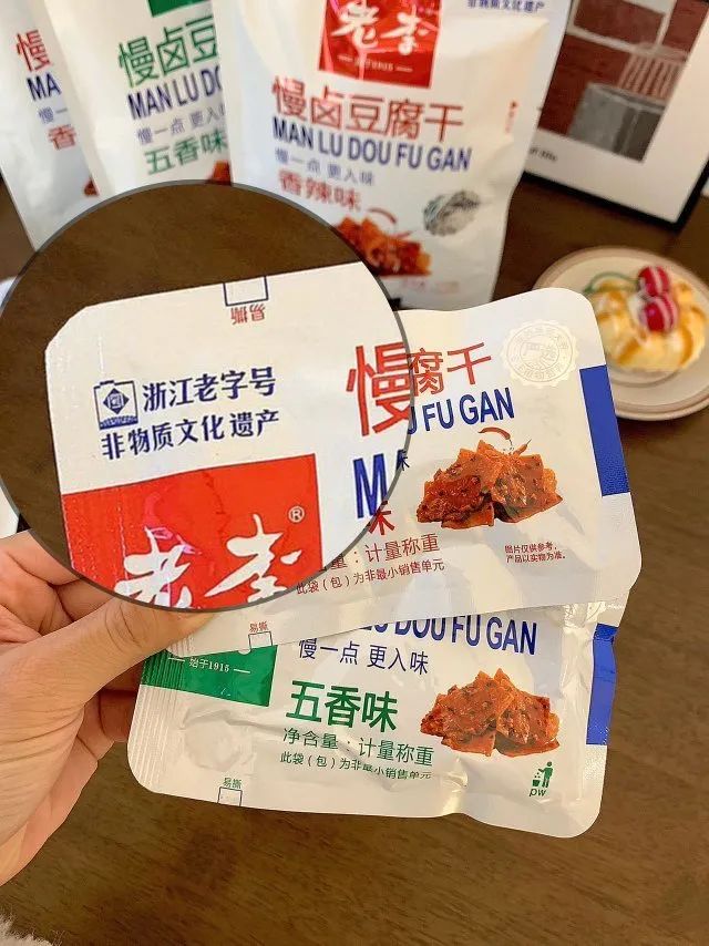 品牌福利?39.9?买4赠1到手5袋35包❗️浙江百年老字号❗️非遗传承?【老李慢卤豆腐干】记忆中的老味道?16道工艺文火慢卤?每一块豆干都吸饱了卤汁?Q弹有韧性?鲜香入味豆香四溢?咬一口扎实过瘾精选非转基因东北黑土地大豆,越吃越香,越嚼越香越吃越上头?砸吧砸吧回味无穷?下酒追剧绝了‼️快乐起飞?两个口味:五香|麻辣 关键字:豆干豆干是很多人都爱的小食?我想100个人里面都挑不出几个不爱吃的吧?跟辣条一样吃起来很上头,但又比辣条好吃健康不止一个度!打开后就能闻到那种飘香四溢的豆香味,想想就流口水的那种——老李慢卤豆腐干而且这种小零食多吃也不易发胖,吃起来解瘾解馋又打发时间?️下酒追剧绝了!一口入魂,从此辣条是路人,小袋独立包装不脏手,都给我冲!旗舰店?59.9/4袋今天开团?39.9/4袋,每一大袋里含有7小包❗️这价格太实惠了!必须囤!追剧吃、聊天吃传承"李顺和"浙江老字号卤制工艺,老李卤制工艺被列入“非物质文化遗产”名录,时至今日荣获近百个奖项,一整面墙都放不完,历时多年,对品质与口味的匠心不变!从村头小商店、小区小店到连锁便利店,再到超市连锁世纪联华、沃尔玛、欧尚、大润发内都有老李的身影??坚持16道工序,文火慢卤熬制,精心选材,非转基因精品东北黑土地大豆,搭配多味品质调配秘制香料,豆香四溢越嚼越香,遵循过程「老老实实」方能「历久弥香」每一块豆干都吸饱了卤汁!Q弹有韧性,鲜香入味,豆香四溢,咬一口扎实过瘾!吃上一袋根本停不下来??而且多吃豆制品营养多多,非转基因黄豆,含有丰富的亚油酸、亚麻酸、维生素、植物蛋白等营养成分能被人体吸收率高达97%,多吃还有增强脑细胞、抗衰老、降低胆固醇包装上有"浙食链"二维码,直接扫码查询就能追溯食品安全全链条,看得见的安心??点击小程序抢