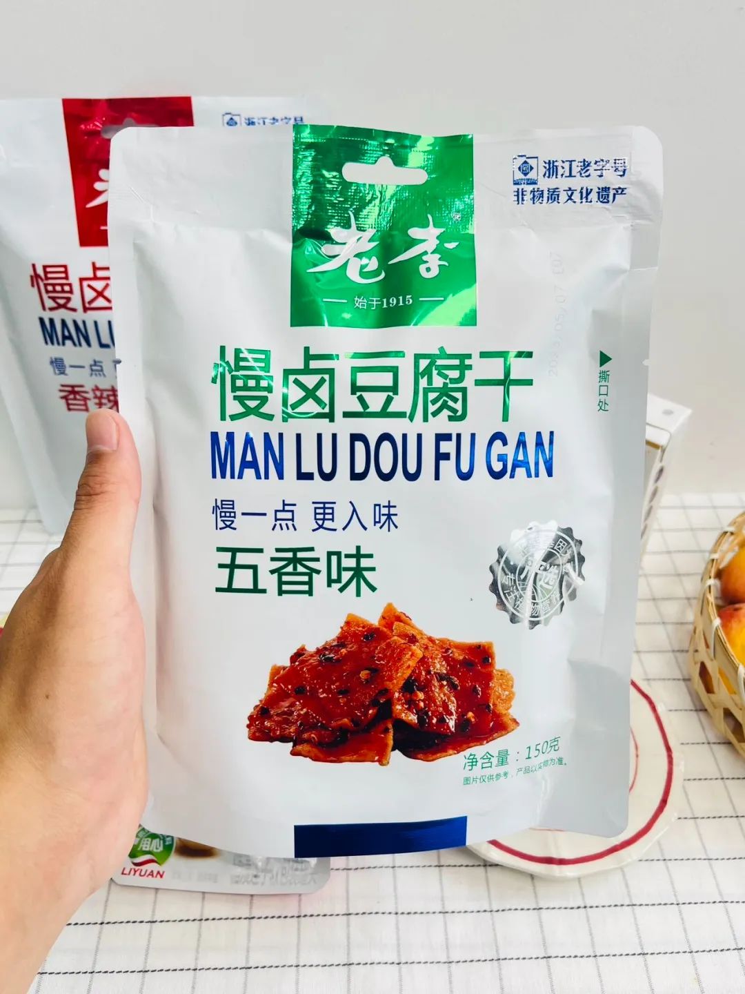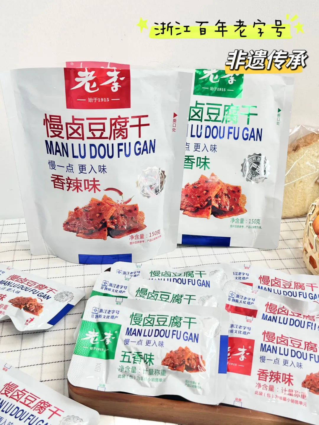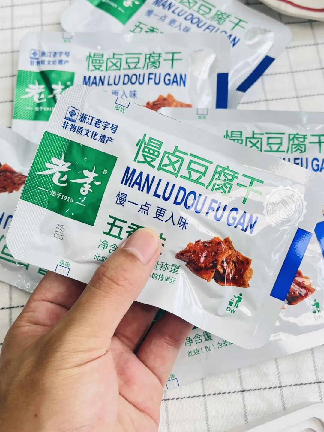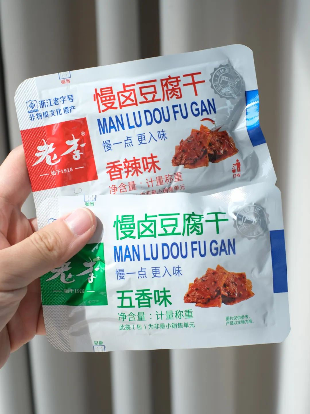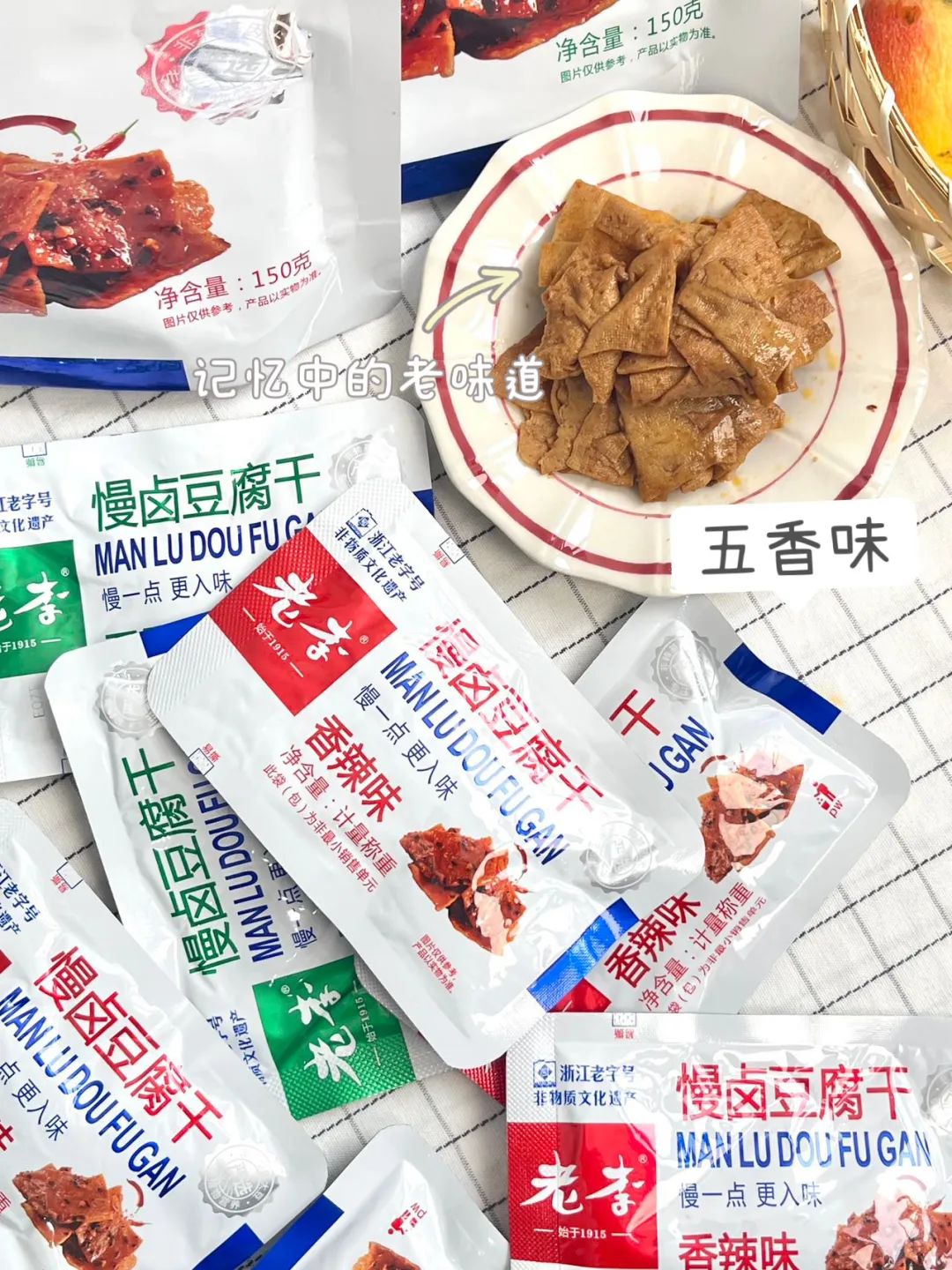 品牌福利?39.9?买4赠1到手5袋35包❗️浙江百年老字号❗️非遗传承?【老李慢卤豆腐干】记忆中的老味道?16道工艺文火慢卤?每一块豆干都吸饱了卤汁?Q弹有韧性?鲜香入味豆香四溢?咬一口扎实过瘾精选非转基因东北黑土地大豆,越吃越香,越嚼越香越吃越上头?砸吧砸吧回味无穷?下酒追剧绝了‼️快乐起飞?两个口味:五香|麻辣 关键字:豆干豆干是很多人都爱的小食?我想100个人里面都挑不出几个不爱吃的吧?跟辣条一样吃起来很上头,但又比辣条好吃健康不止一个度!打开后就能闻到那种飘香四溢的豆香味,想想就流口水的那种——老李慢卤豆腐干而且这种小零食多吃也不易发胖,吃起来解瘾解馋又打发时间?️下酒追剧绝了!一口入魂,从此辣条是路人,小袋独立包装不脏手,都给我冲!旗舰店?59.9/4袋今天开团?39.9/4袋,每一大袋里含有7小包❗️这价格太实惠了!必须囤!追剧吃、聊天吃传承"李顺和"浙江老字号卤制工艺,老李卤制工艺被列入“非物质文化遗产”名录,时至今日荣获近百个奖项,一整面墙都放不完,历时多年,对品质与口味的匠心不变!从村头小商店、小区小店到连锁便利店,再到超市连锁世纪联华、沃尔玛、欧尚、大润发内都有老李的身影??坚持16道工序,文火慢卤熬制,精心选材,非转基因精品东北黑土地大豆,搭配多味品质调配秘制香料,豆香四溢越嚼越香,遵循过程「老老实实」方能「历久弥香」每一块豆干都吸饱了卤汁!Q弹有韧性,鲜香入味,豆香四溢,咬一口扎实过瘾!吃上一袋根本停不下来??而且多吃豆制品营养多多,非转基因黄豆,含有丰富的亚油酸、亚麻酸、维生素、植物蛋白等营养成分能被人体吸收率高达97%,多吃还有增强脑细胞、抗衰老、降低胆固醇包装上有"浙食链"二维码,直接扫码查询就能追溯食品安全全链条,看得见的安心??点击小程序抢