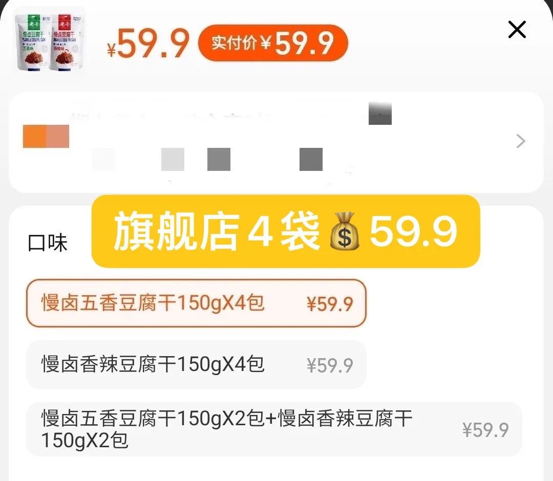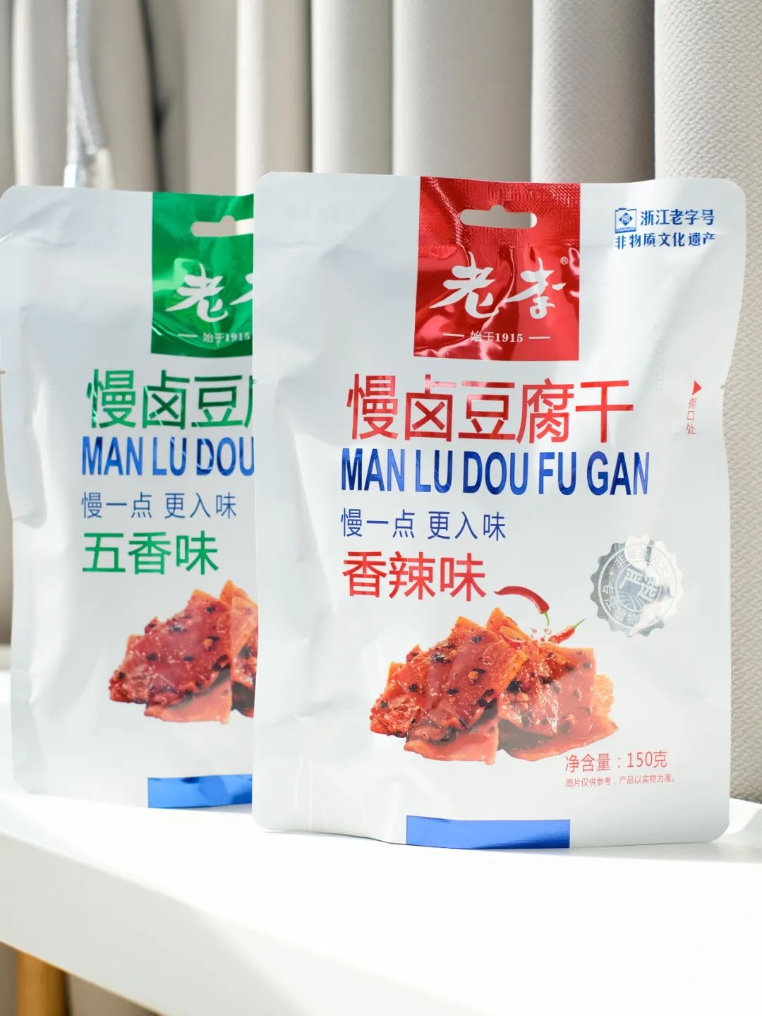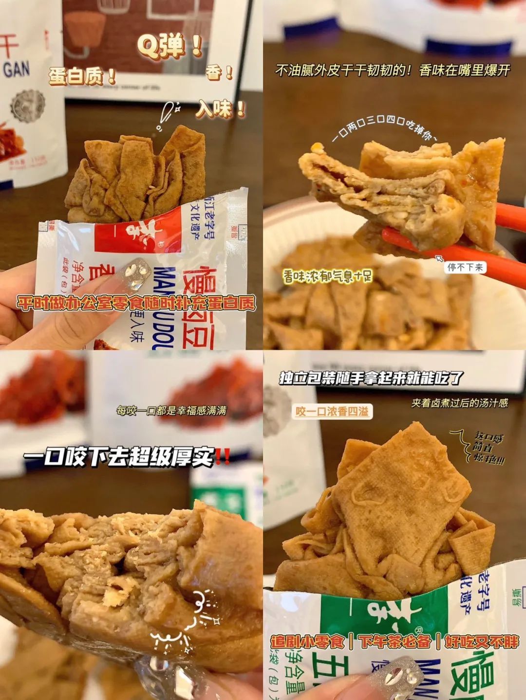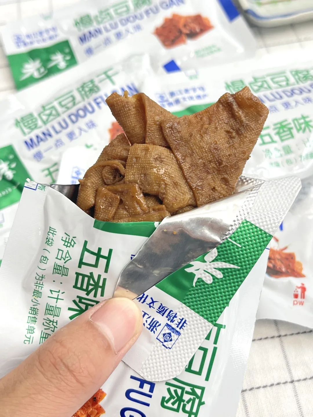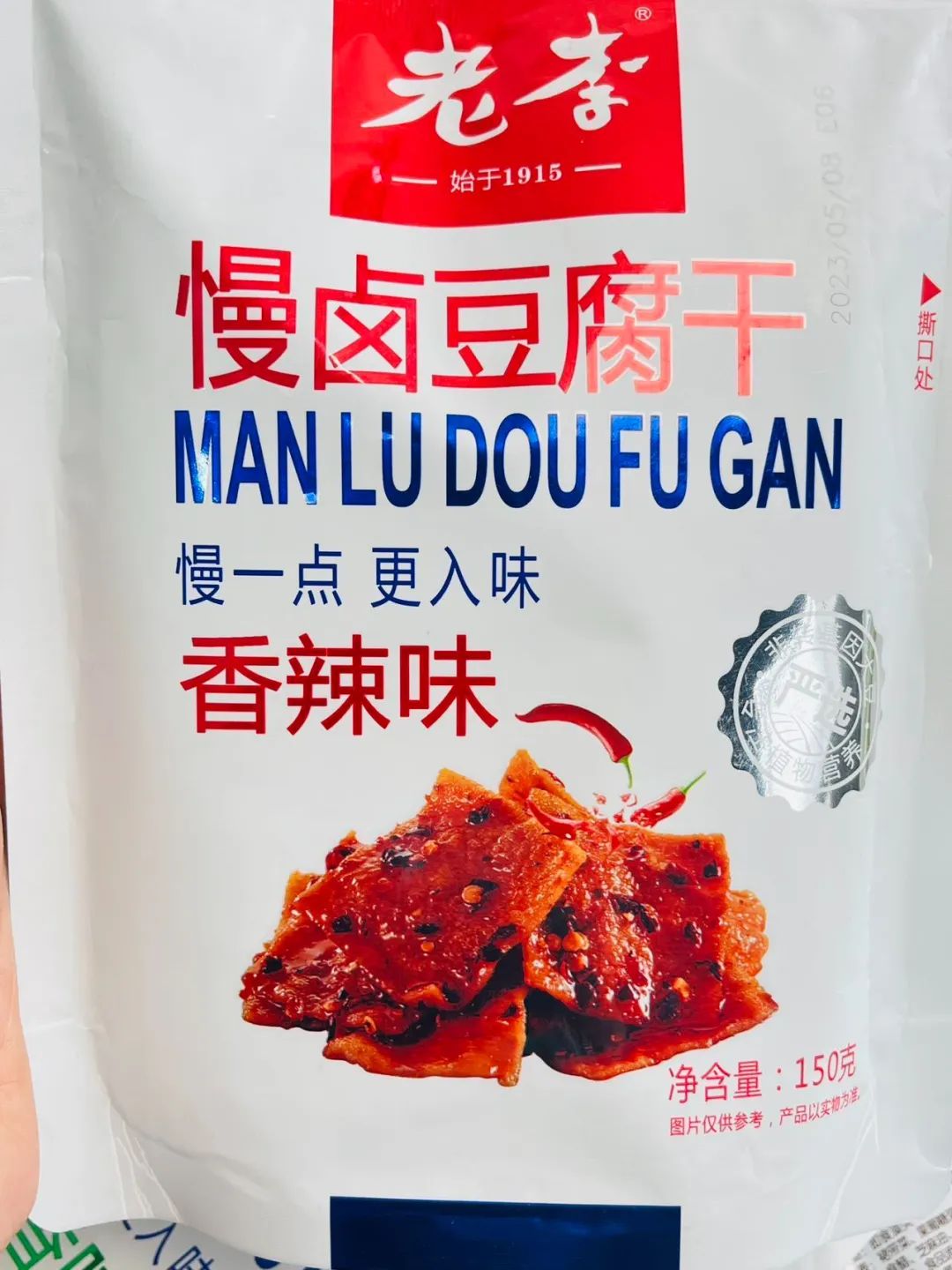 品牌福利?39.9?买4赠1到手5袋35包❗️浙江百年老字号❗️非遗传承?【老李慢卤豆腐干】记忆中的老味道?16道工艺文火慢卤?每一块豆干都吸饱了卤汁?Q弹有韧性?鲜香入味豆香四溢?咬一口扎实过瘾精选非转基因东北黑土地大豆,越吃越香,越嚼越香越吃越上头?砸吧砸吧回味无穷?下酒追剧绝了‼️快乐起飞?两个口味:五香|麻辣 关键字:豆干豆干是很多人都爱的小食?我想100个人里面都挑不出几个不爱吃的吧?跟辣条一样吃起来很上头,但又比辣条好吃健康不止一个度!打开后就能闻到那种飘香四溢的豆香味,想想就流口水的那种——老李慢卤豆腐干而且这种小零食多吃也不易发胖,吃起来解瘾解馋又打发时间?️下酒追剧绝了!一口入魂,从此辣条是路人,小袋独立包装不脏手,都给我冲!旗舰店?59.9/4袋今天开团?39.9/4袋,每一大袋里含有7小包❗️这价格太实惠了!必须囤!追剧吃、聊天吃传承"李顺和"浙江老字号卤制工艺,老李卤制工艺被列入“非物质文化遗产”名录,时至今日荣获近百个奖项,一整面墙都放不完,历时多年,对品质与口味的匠心不变!从村头小商店、小区小店到连锁便利店,再到超市连锁世纪联华、沃尔玛、欧尚、大润发内都有老李的身影??坚持16道工序,文火慢卤熬制,精心选材,非转基因精品东北黑土地大豆,搭配多味品质调配秘制香料,豆香四溢越嚼越香,遵循过程「老老实实」方能「历久弥香」每一块豆干都吸饱了卤汁!Q弹有韧性,鲜香入味,豆香四溢,咬一口扎实过瘾!吃上一袋根本停不下来??而且多吃豆制品营养多多,非转基因黄豆,含有丰富的亚油酸、亚麻酸、维生素、植物蛋白等营养成分能被人体吸收率高达97%,多吃还有增强脑细胞、抗衰老、降低胆固醇包装上有"浙食链"二维码,直接扫码查询就能追溯食品安全全链条,看得见的安心??点击小程序抢