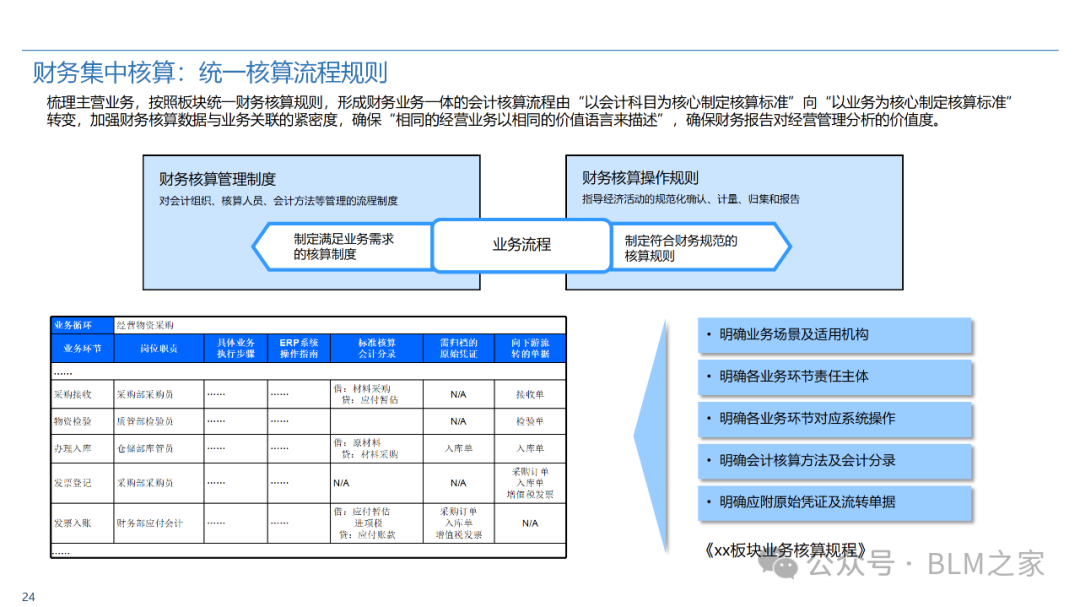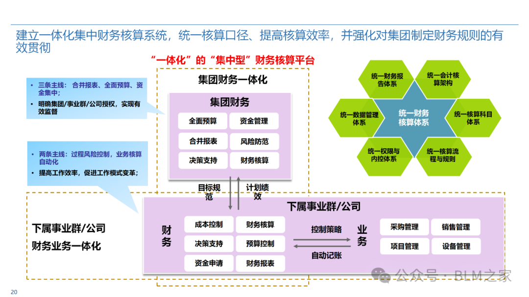梳理主营业务,按照板块统一财务核算规则,形成财务业务一体的会计核算流程由“以会计科目为核心制定核算标准”向“以业务为核心制定核算标准”转变,加强财务核算数据与业务关联的紧密度,确保“相同的经营业务以相同的价值语言来描述”,确保财务报告对经营管理分析的价值度。