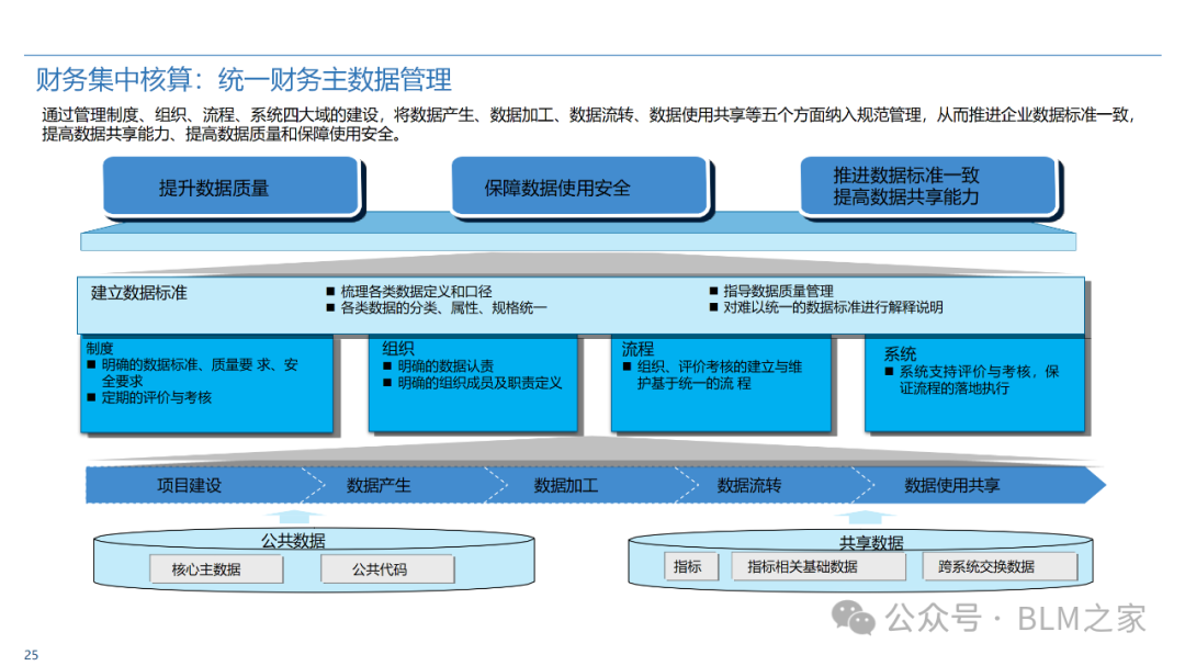 通过管理制度、组织、流程、系统四大域的建设,将数据产生、数据加工、数据流转、数据使用共享等五个方面纳入规范管理,从而推进企业数据标准一致,提高数据共享能力、提高数据质量和保障使用安全。