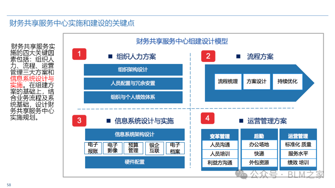 财务共享服务实施的四大关键因素包括:组织人力、流程、运营管理三大方案和信息系统设计与实施。在组建方案的基础上,结合业务流程及系统基础,设计财务共享服务中心实施规划。