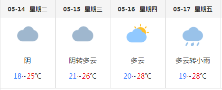 1、上海市5月15日-17日天气情况:预计多云天气为主,温度约19-26度,有小到中雨,提醒大家注意天气情况,适当增减衣服的同时备好雨伞!