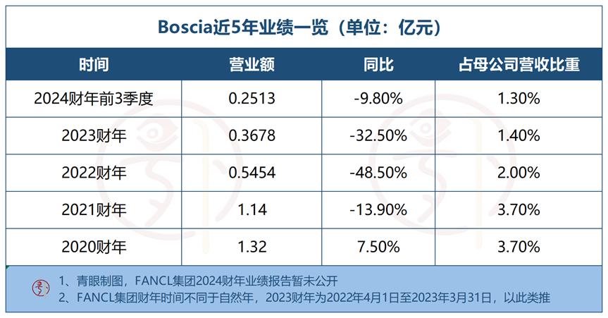 青眼号外梳理发现,就近5年业绩来看,Boscia在2020财年巅峰时营业额也仅有1.32亿元,此后业绩便呈现出下滑态势,2023财年营业额已较此前缩水2/3,仅为3678万元。FANCL集团在财报中表示,下滑的主要原因是面向实体店的批发销售不景气以及疫情的负面影响。