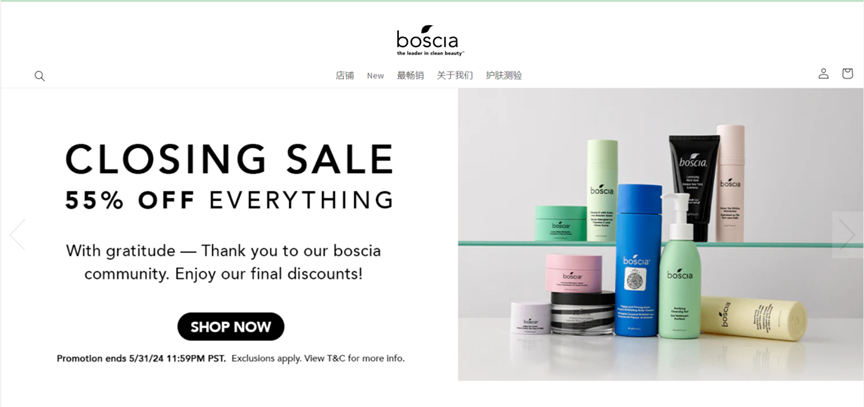然而,Boscia官网近期发布声明显示,品牌官网将于5月31日正式关闭,关闭前,全网站产品均以4.5折清仓。“我们很遗憾地通知您,我们将在5月31日关闭我们的网站。对您多年来的支持表示衷心的感谢。谢谢你参与我们的这一场旅程。”