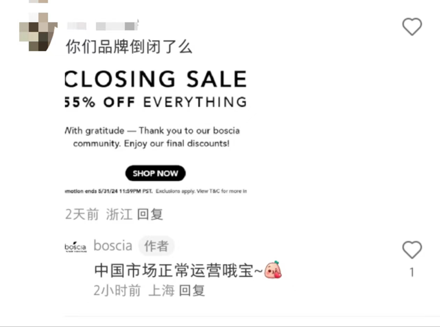 而对于Boscia关闭北美官网是否会影响到中国区运营,青眼号外也第一时间向天猫Boscia海外旗舰店求证,该店铺客服回应称,店铺产品全部为海外直供,目前并未收到闭店通知,不影响中国地区运营。Boscia官方小红书账号也在评论区回复网友称,中国市场正常运营。