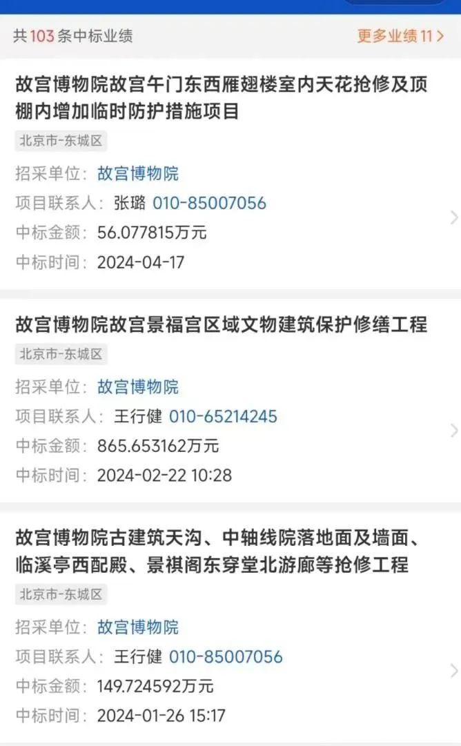 上网搜一下发现,这家公司在今年的短短三个月之内,中标了故宫博物院三个修缮工程,中标金额约1070万元。不得不说,还是很有“实力”的。