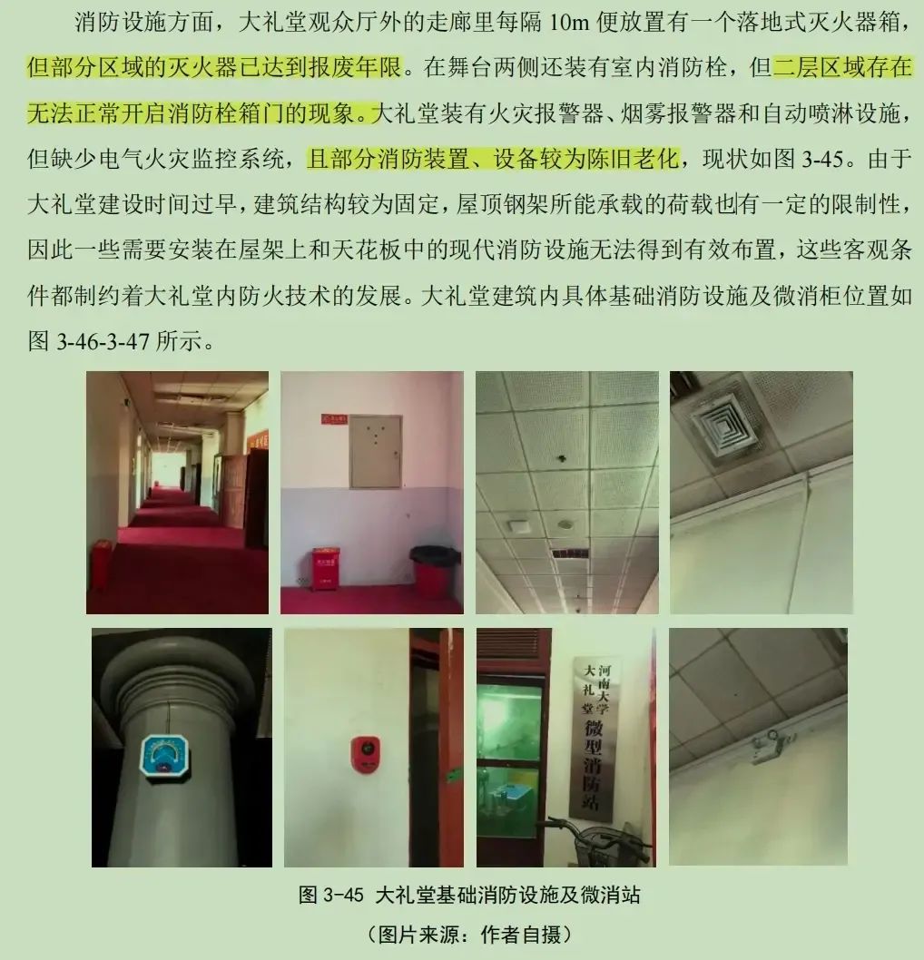 当然,2022年河南大学的研究生翟某某写了一篇论文,题目为教育建筑遗产的消防与可持续保护利用研究,以河南大学近代建筑群为例,在论文中已经指出了大礼堂的消防设备老旧,灭火器已达报废年限及部分消火栓箱门无法开启等问题。这也说明,当时的大礼堂确实在防火上存在疏漏。