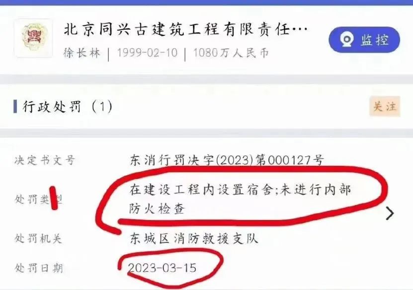 但这家公司在2023年3月份,受到过行政处罚,处罚的类型是在建设工程内设置宿舍,未进行内部防火检查。行政处罚单位是北京东城区消防救援支队。