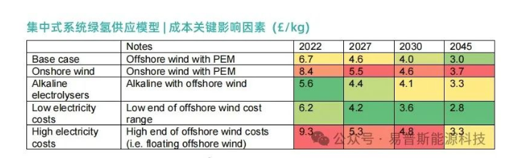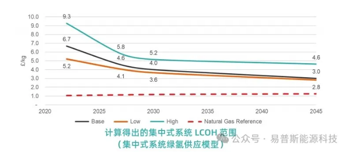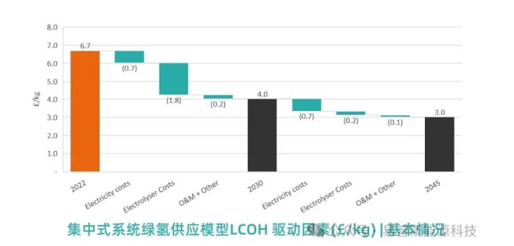 从2022年到2027年,成本预计将降低21%至38%,而2027年之后,成本降低的速率预计将减缓。预计到2045年,采用集中模型的绿氢成本将在每公斤2.8至4.6英镑之间。