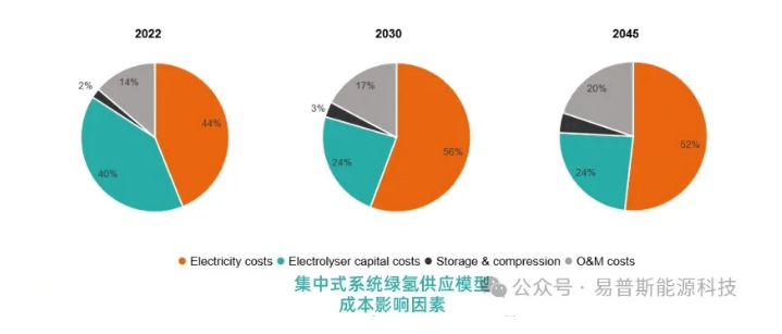 2022年,采用集中模型生产绿色氢气的成本估计在每公斤5.2至9.3英镑之间。主要驱动因素是电力输入成本和电解设备的资本成本,这两者分别占2022年氢气总平准化成本的45%和41%。由于电解设备资本成本的显著降低,电解设备所占比例在2030年和2045年有所下降,使得电力成本成为长期的关键成本驱动因素。