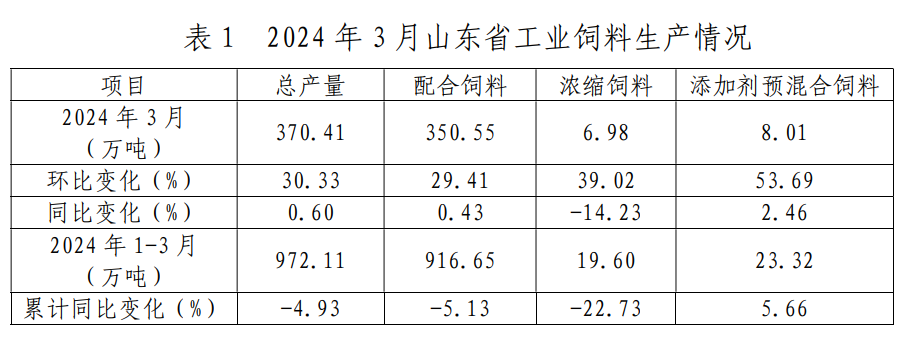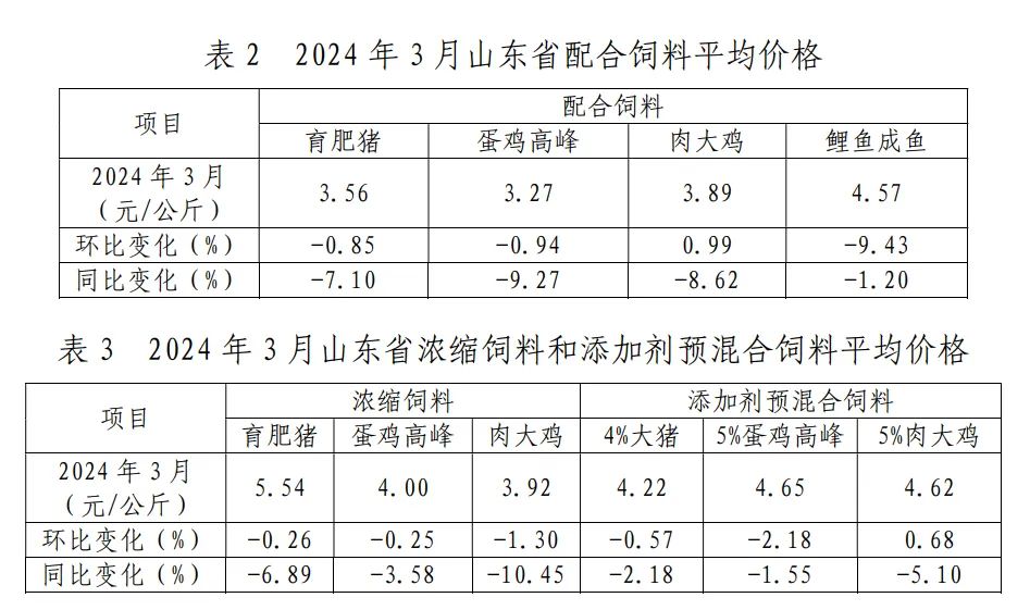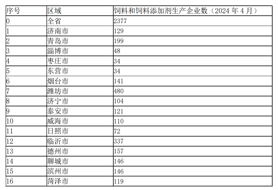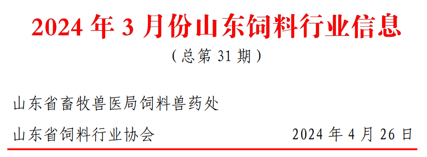 添加剂方面,维生素市场成交低迷,厂家停报、提价等对市场刺激作用有限,下游用户小批量补货为主;贸易市场跟风追涨动力不足,据测算,3月份饲料中维生素使用成本同比下跌47%左右,环比持平。 氨基酸厂家受亏损影响,挺价意愿强烈,需求暂未恢复,市场购销持续低迷,氨基酸价格涨跌互现。3月赖氨酸盐酸盐均价8.73元/kg,同比下跌28.52%,环比上涨0.66%;赖氨酸硫酸盐均价5.69元/kg,同比下跌16.05%,环比上涨0.31%;蛋氨酸均价17.30元/kg,同比下跌22.6%,环比下跌7.2%;苏氨酸均价9.14元/kg,同比下跌22.11%,环比上涨0.94%。 四、政务汇集 1、3月11日,省局发布“关于印发《2024年山东省饲料质量安全监管工作方案》的通知”(鲁牧饲药发〔2024〕5号)。《方案》旨在为强化饲料监管,提高饲料和饲料添加剂产品质量安全水平,保障动物健康和食品安全,并给出了工作目标和工作内容等具体办法。 截至2024年4月下旬,全省现有饲料和饲料添加剂生产企业2377家,比3月中旬生产企业2406家,减少29家。