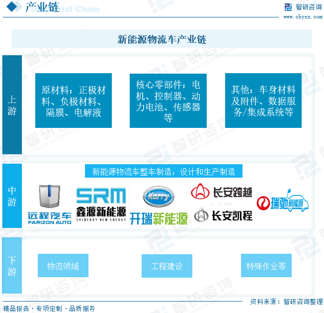 新能源物流车产业链上游为原材料和核心零部件,原材料包括正极材料、负极材料、隔膜和电解液,核心零部件包括电机、控制器、动力电池、传感器等。产业链中游是新能源物流车整车制造,包括设计和生产制造,主要新能源物流车制造商包括远程汽车、长安汽车、东风汽车等。产业链下游为新能源物流车应用场景,包括物流领域、工程建设、特殊作业等领域。