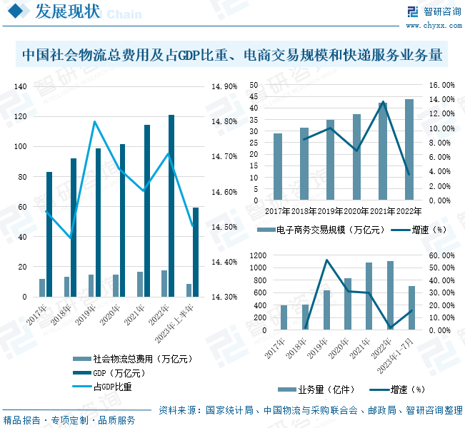 新能源物流车作为新能源汽车的分支市场,近年来,得益于电商和快递行业的快速发展,已经迅速崛起成为新增长极。与此同时,我国新能源物流车市场正不断释放需求和政策红利,带动新能源物流车销售。随着网购的兴起,加上精准送达等需求的影响,直接带动了快递和物流行业的发展,据统计,2023年1-7月,我国快递服务业务量为703亿件,较上年同期增长15.5%。2023年上半年,我国社会物流总费用为8.6万亿元,GDP为59.3万亿元,占GDP比重为14.5%。近年来,受柴油国六法规实施、油价连连攀升、运价低迷等不利因素的影响,传统汽车的物流运输市场需求低迷,加上“双碳”战略的持续推动下,城市交通管理和环保政策也不断鼓励新能源物流车在城市配送领域的应用,新能源物流车逐渐成为政府大力推广的新型交通工具,为新能源物流车市场带来了巨大的需求窗口。
