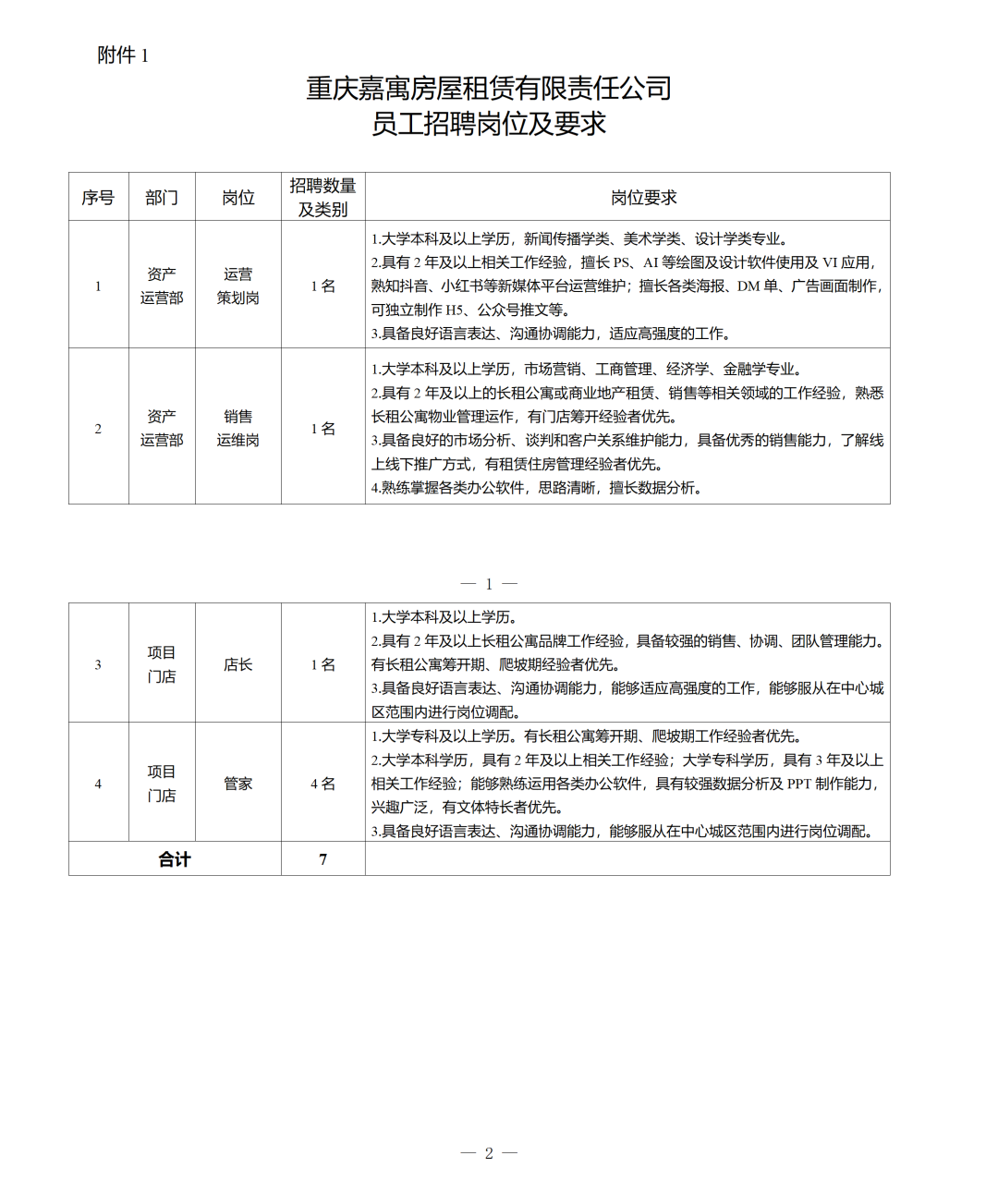 详情见附件1:重庆嘉寓房屋租赁有限责任公司员工招聘岗位及要求。