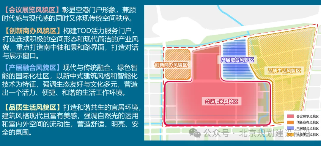 整体形成生态、低碳、复合、多元、活力的展城风貌,落实细化街区控规对风貌的分级管控高求,突出地区特色,划分为会议展览、创新商办、产居融合、品质生活四类风貌区。