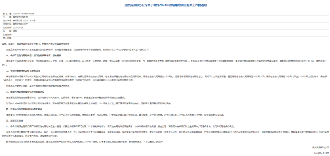 近日,自然资源部发布《关于做好2024年住宅用地供应有关工作的通知》,明确各地要按照“以人定房,以房定地”的原则,盘活存量与优化增量相结合,促进房地产市场供求关系健康稳定。