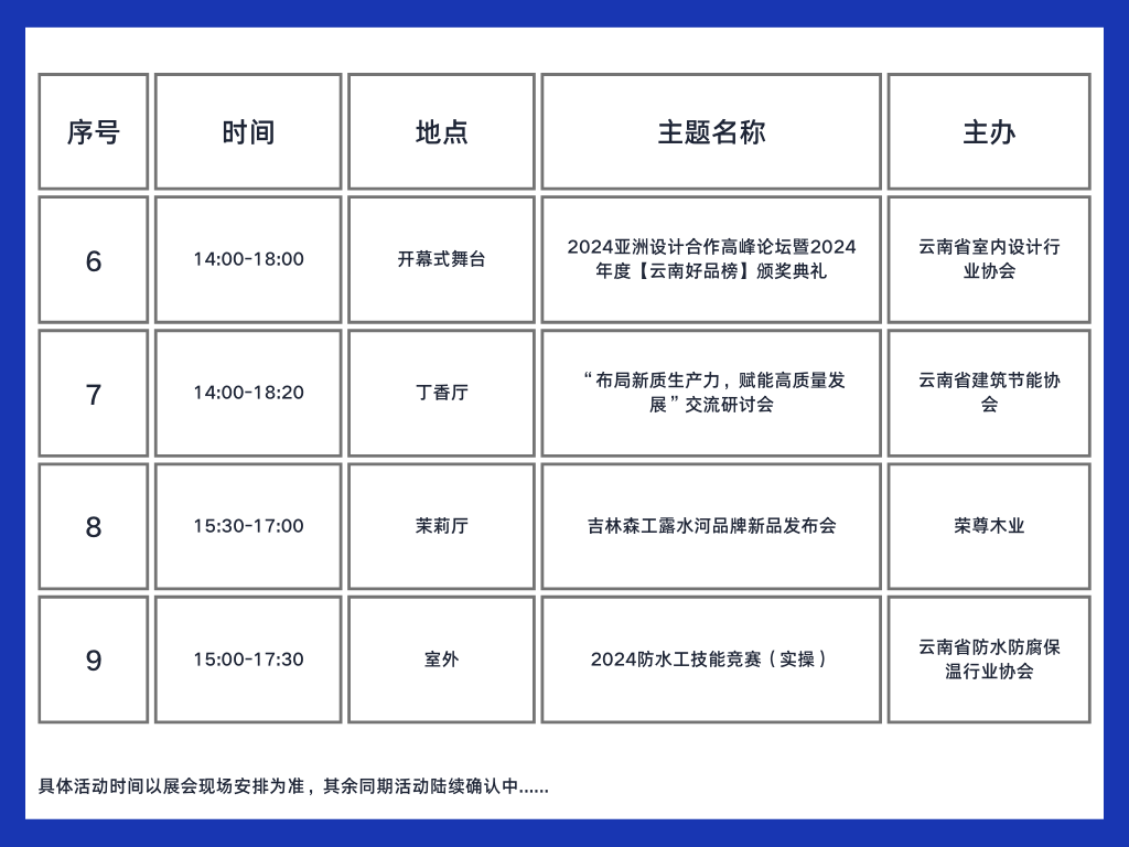 2024第十四届云南建博会15+场同期活动,包括高峰论坛暨颁奖典礼、设计师圆桌会议、协会推介交流、协会研讨会、展商新品推介、技能竞赛等,涉及建装行业多方主题,促进品牌发展、挖掘品牌背后的价值,助力专业人士把握建装新趋势。