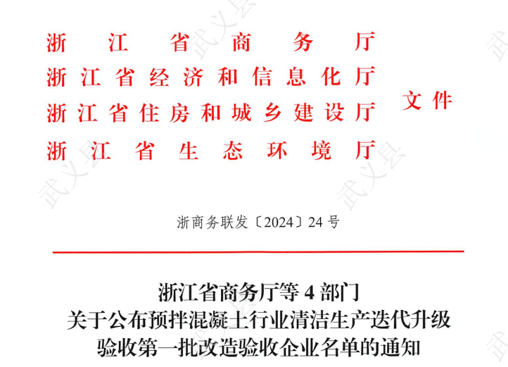 近日,浙江省商务厅、浙江省经济和信息化厅、浙江省住房和城乡建设厅、浙江省生态环境厅4部门印发了《关于公布预拌混凝土行业清洁生产迭代升级验收第一批改造验收企业名单的通知》,武交集团下属浙江东创建筑材料有限公司(以下简称东创公司)被认定为浙江省预拌混凝土行业清洁生产迭代升级技术示范企业,成为武义县唯一一家获此殊荣的商品混凝土企业。