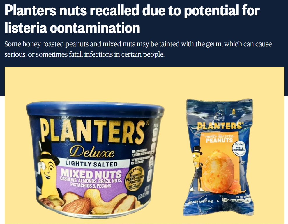 Hormel食品公司正在召回运往美国五个州Dollar Tree和Publix的两种Planters产品——花生和混合坚果,因为它们可能被李斯特菌污染。