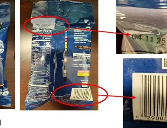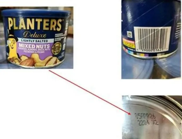 被召回花生的“最佳食用日期”为2025年4月11日,包装UPC代码为2900002097。被召回的混合坚果的“最佳食用日期”为2026年4月5日,罐头侧面的PPC代码为2900001621。