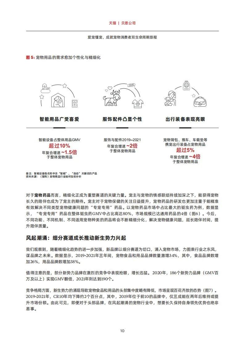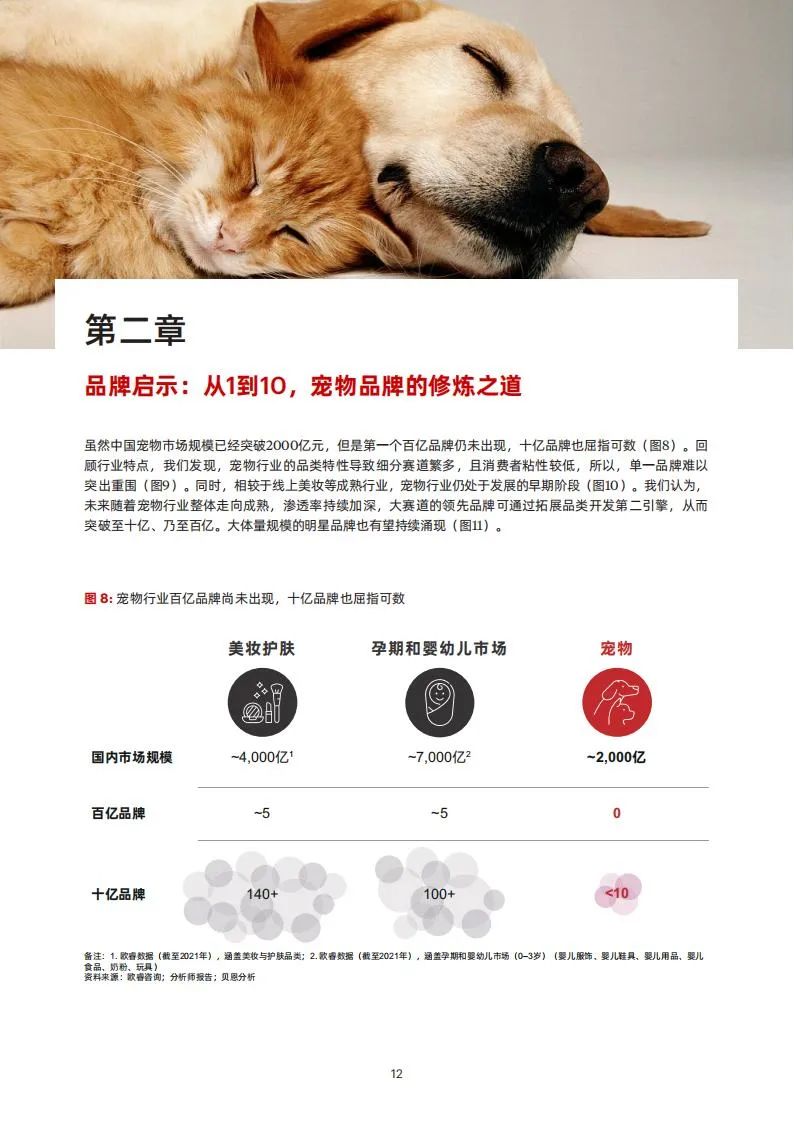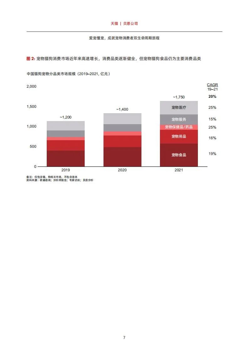 近年来,宠物猫狗的消费市场整体呈现出双位数的增长,2019–2021年复合增速达到20%(图2)。与此同时,宠物猫狗的消费品类也在逐步健全,比如,宠物服务、宠物医疗开始崭露头角,但是,食品仍为主要的消费品类,占整体市场接近四成。