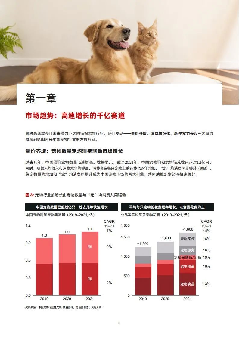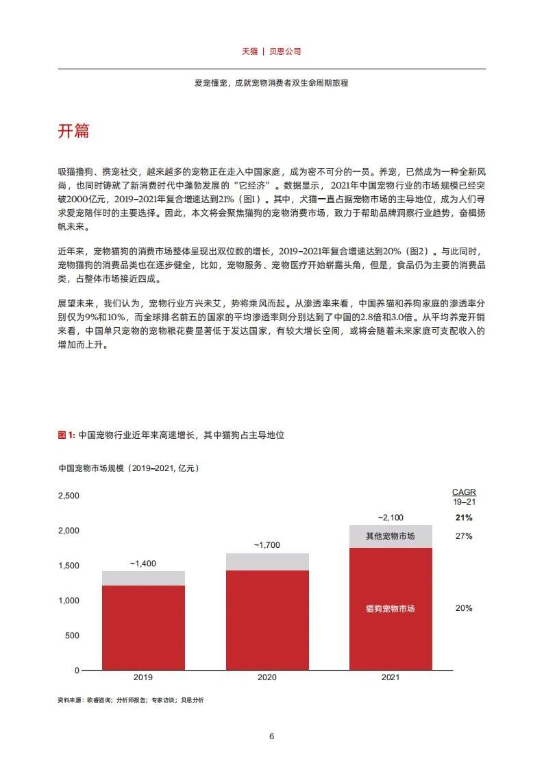 吸猫撸狗、携宠社交,越来越多的宠物正在走入中国家庭,成为密不可分的一员。养宠,已然成为一种全新风尚,也同时铸就了新消费时代中蓬勃发展的“它经济”。数据显示, 2021年中国宠物行业的市场规模已经突破2000亿元,2019–2021年复合增速达到21%(图1)。其中,犬猫一直占据宠物市场的主导地位,成为人们寻求爱宠陪伴时的主要选择。因此,本文将会聚焦猫狗的宠物消费市场,致力于帮助品牌洞察行业趋势,奋楫扬帆未来。