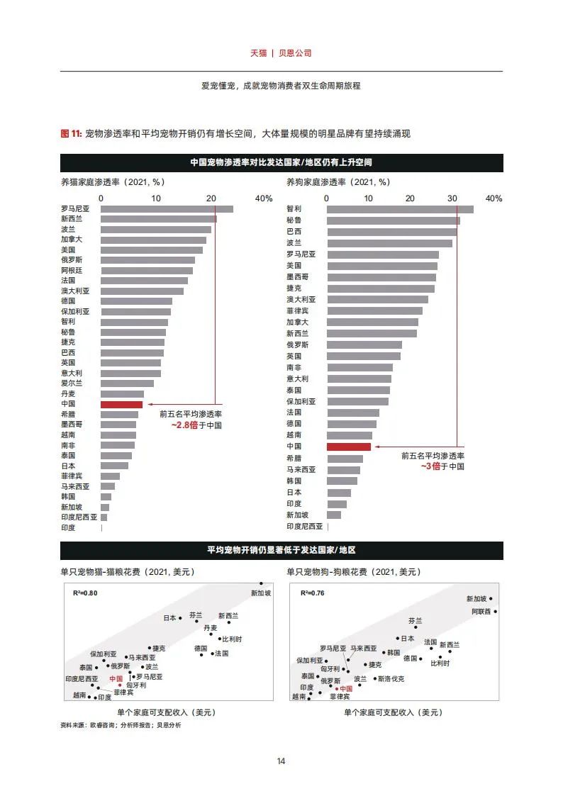 展望未来,我们认为,宠物行业方兴未艾,势将乘风而起。从渗透率来看,中国养猫和养狗家庭的渗透率分别仅为9%和10%,而全球排名前五的国家的平均渗透率则分别达到了中国的2.8倍和3.0倍。从平均养宠开销来看,中国单只宠物的宠物粮花费显著低于发达国家,有较大增长空间,或将会随着未来家庭可支配收入的增加而上升。