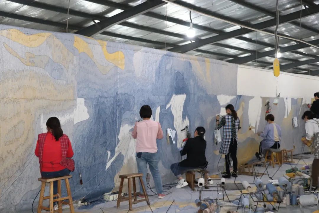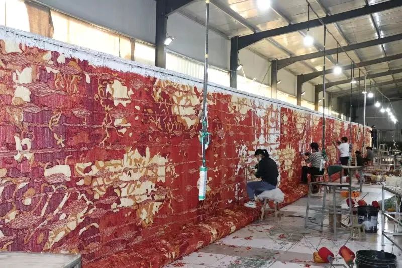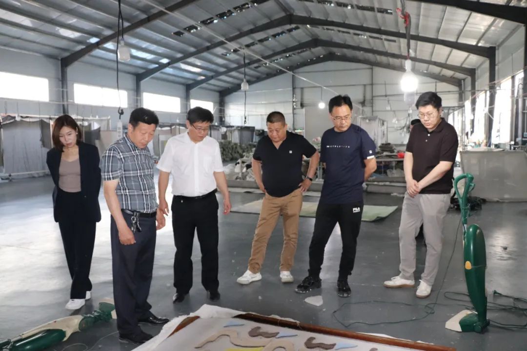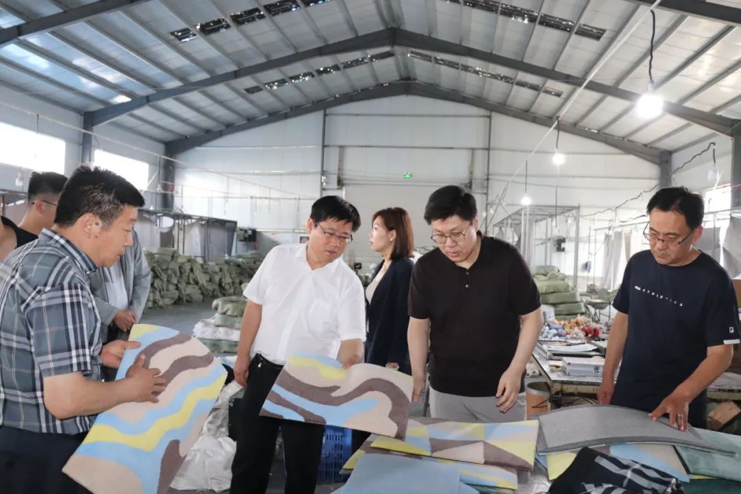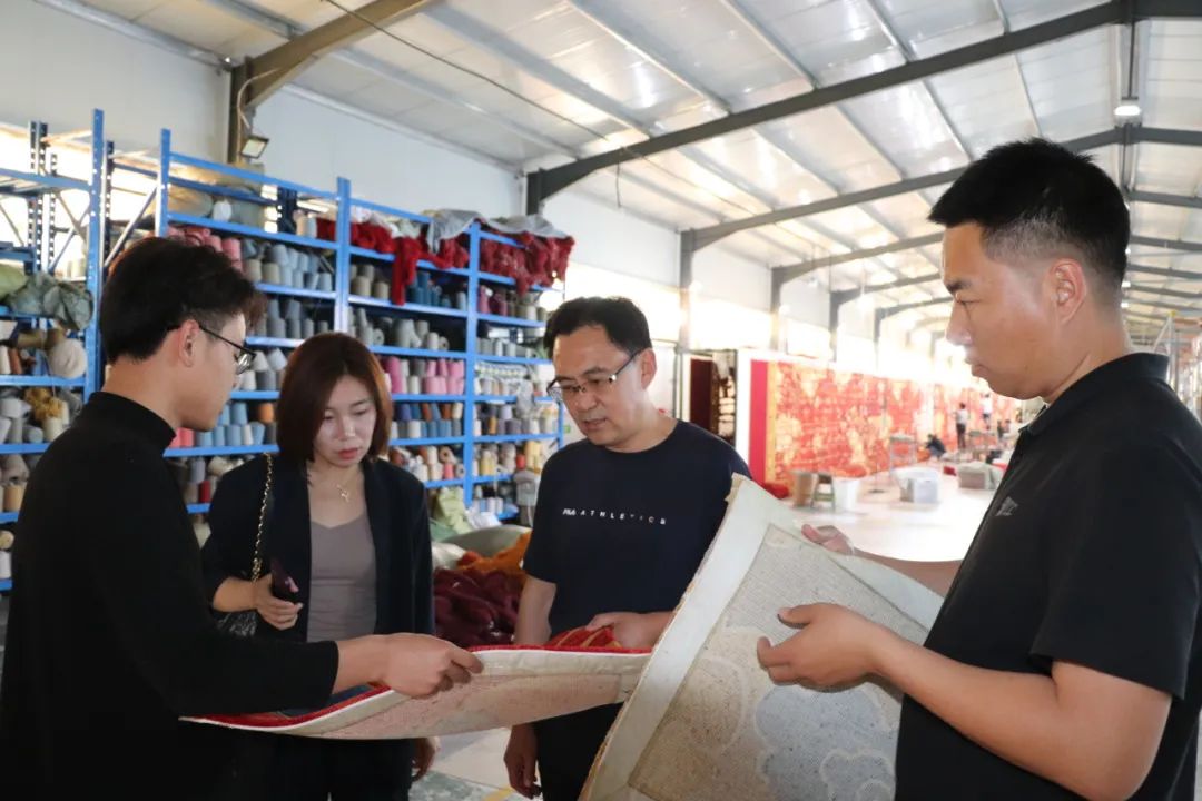 殷楠一行先后到鲁徳地毯、诚创地毯、谊杰地毯实地考察,听取了企业负责人介绍,实地观看手工地毯织作技艺和丰富多彩的图案纹样展示,深入了解企业生产及国内外产销情况。