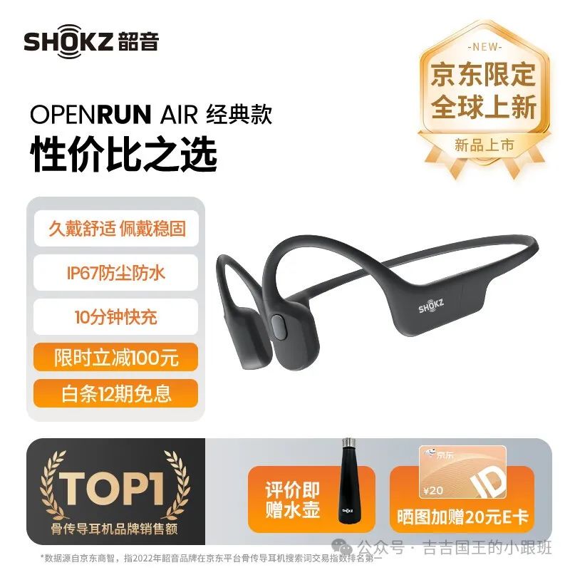 韶音(SHOKZ)OpenRun Air 骨传导蓝牙无线耳机是一款热销产品,由韶音(SHOKZ)品牌生产。这款耳机采用开放式设计,使用户可以在使用耳机时仍然能够听到周围的声音,从而提高安全性。此外,它还具有长续航特性,可以支持 8 小时的播放时间。此外,它还支持闪电快充,10 分钟的充电就可以提供 1.5 小时的播放时间。这款耳机还具有防水和防汗特性,非常适合户外运动和跑步等活动。