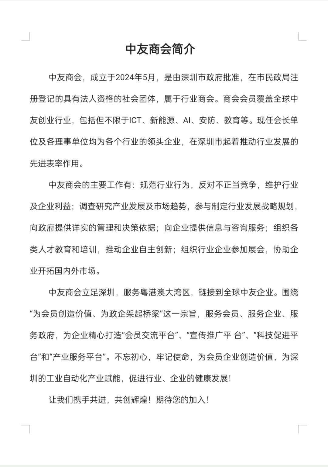 中友商会立足深圳,服务粤港澳大湾区,链接到全球中友企业。围绕“为会员创造价值、为政企架起桥梁”这一宗旨,服务会员、服务企业、服务政府,为企业精心打造“会员交流平台”、“宣传推广平 台”、“科技促进平台”和“产业服务平台”。不忘初心,牢记使命,为会员企业创造价值,为深圳的工业自动化产业赋能,促进行业、企业的健康发展!